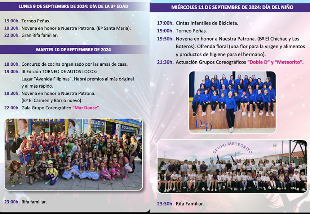 Avanzamos el programa de actos de los festejos patronales entre hoy y el miércoles, destacando la tercera edición de los autos-locos del martes y las exhibiciones de los grupos coreográficos MarDance, Doble D y Meteorito, además del concurso de cocina, que alcanza su trigésimo novena edición. También comienzan las competiciones entre peñas.