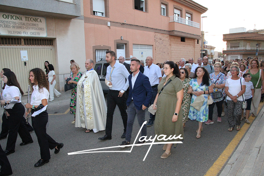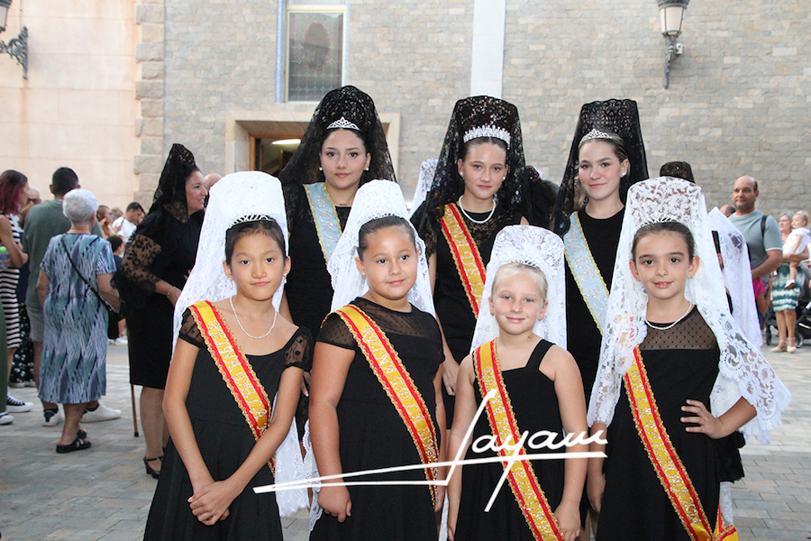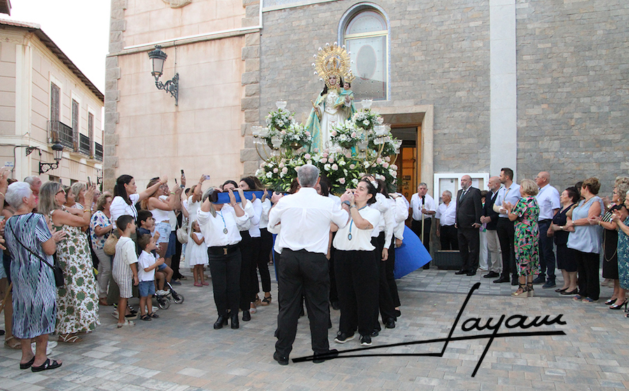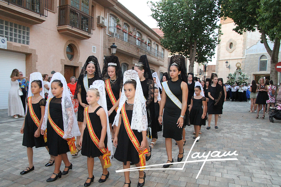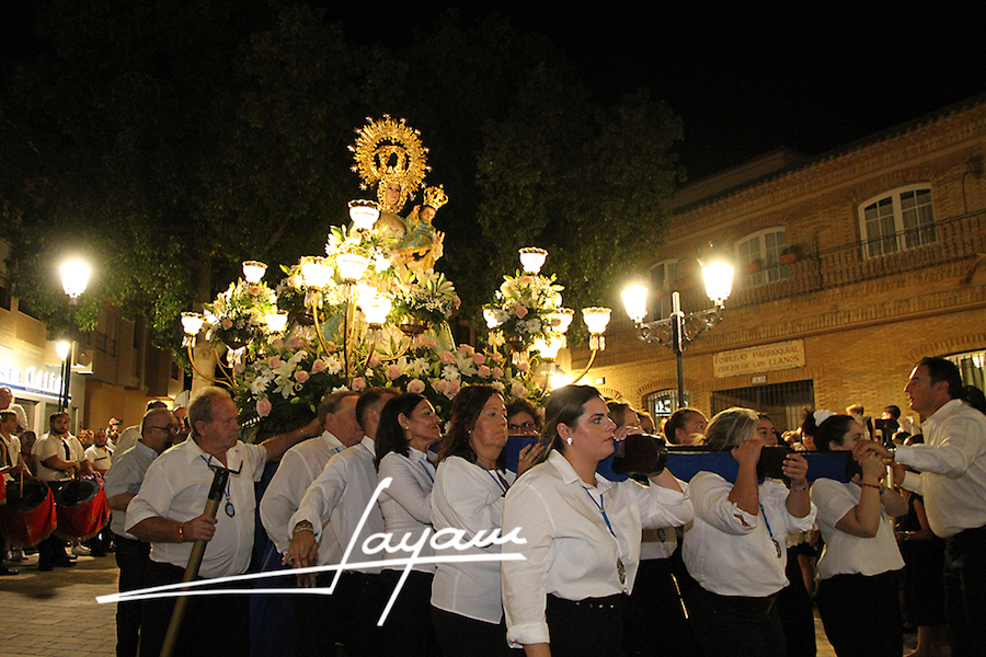 Imágenes de la salida a hombros de la Virgen de los Llanos en procesión para recorrer su pueblo en compañía de un manto de fieles.