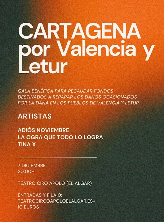 Teatro Circo Apolo de El Algar acogerá este próximo sábado, 7 de diciembre, un espectáculo benéfico para recaudar fondos para reparar los daños y ayudar a los afectados por las riadas que sufrieron la Comunidad Valenciana y el pueblo albaceteño. Actuarán 'Adiós noviembre', 'La ogra que todo lo logra' y 'Tina X'. Las entradas cuestan 10 euros y hay habilitada una fila 0.