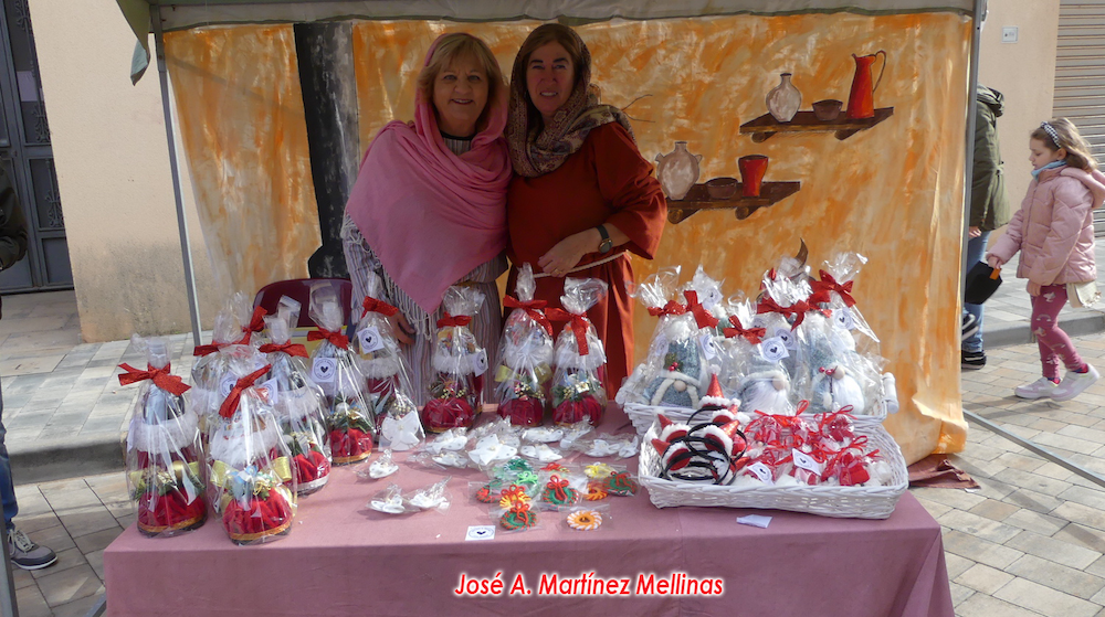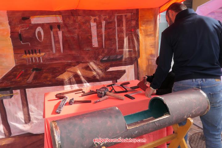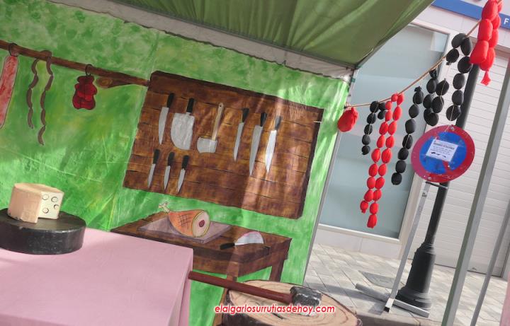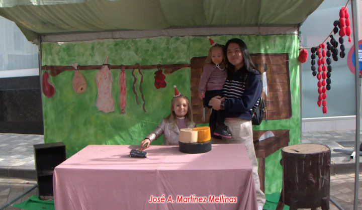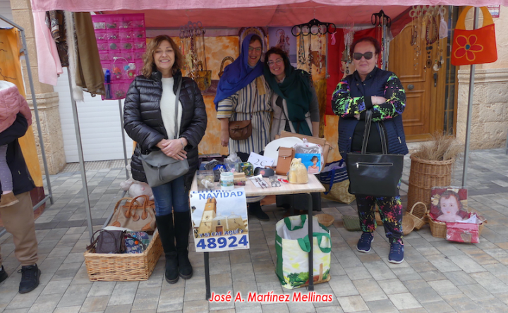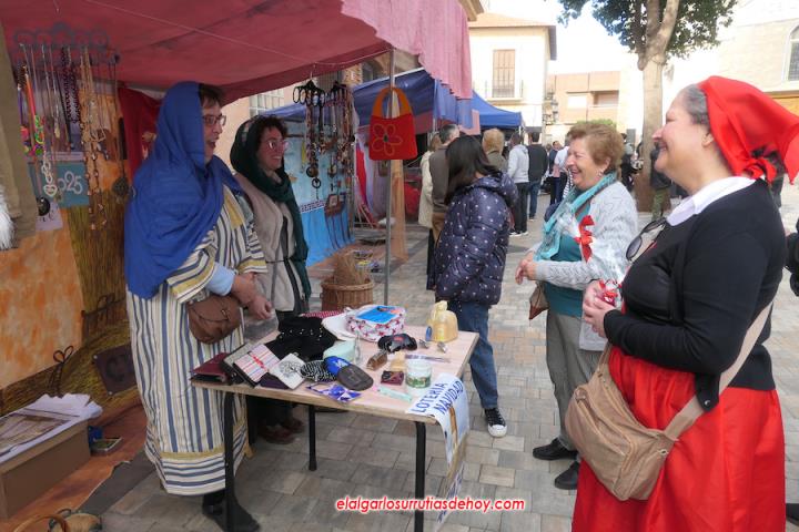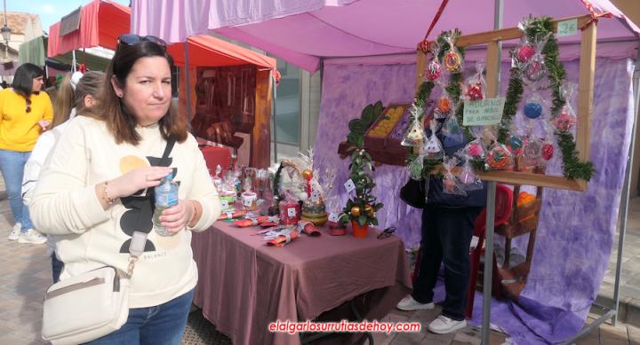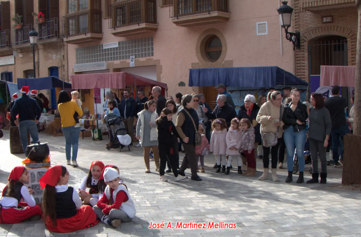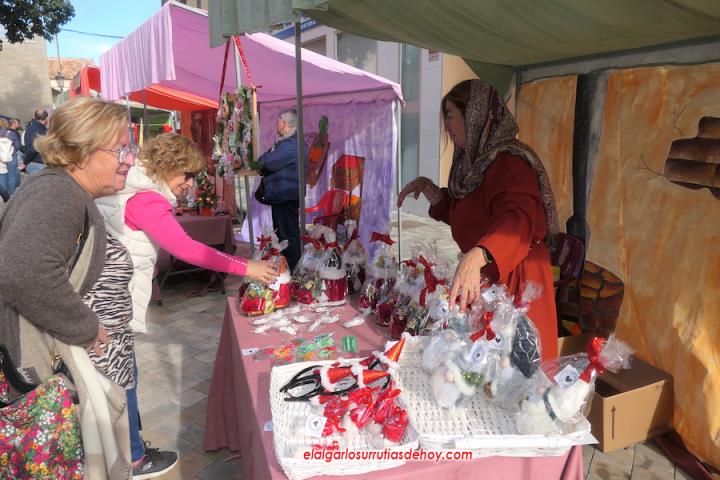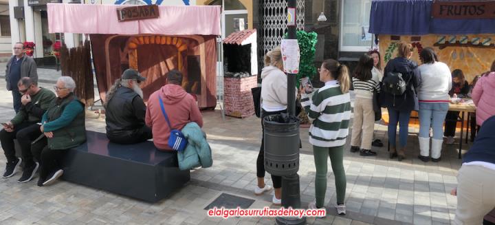 Durante toda la jornada, además de la música navideña, estuvieron activos los puestos de un mercadillo, que combinaba construcciones propias de un belén, como la carpintería o la carnicería, con puestos de ventas de productos artesanos.
