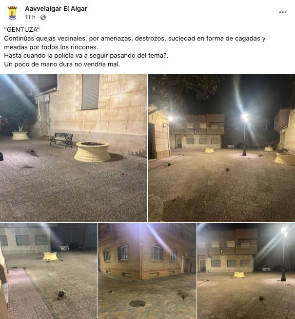 La Asociación de Vecinos de El Algar ha publicado en su perfil de Facebook varias fotos de recientes destrozos en el centro urbano del pueblo con el siguiente texto: "Gentuza. Continúas quejas vecinales por amenazas, destrozos, suciedad en forma de cagadas y meadas por todos los rincones. ¿Hasta cuándo la policía va a seguir pasando del tema? Un poco de mano dura no vendría mal".
