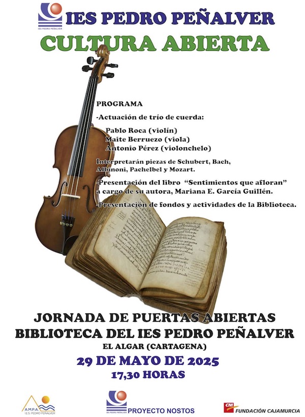 la 'Jornada de puertas abiertas' de la biblioteca del IES Pedro Peñalver de El Algar tendrá lugar hoy, jueves 29 de mayo de 2025, a las 17.30 horas, en la biblioteca del instituto. Se trata de una jornada abierta a las familias en la que tendrá lugar un concierto de cuerda, la presentación del libro 'Sentimientos que afloran' a cargo de su autora y una presentación de los recursos y actividades de la biblioteca destinados a alumnado y familias.