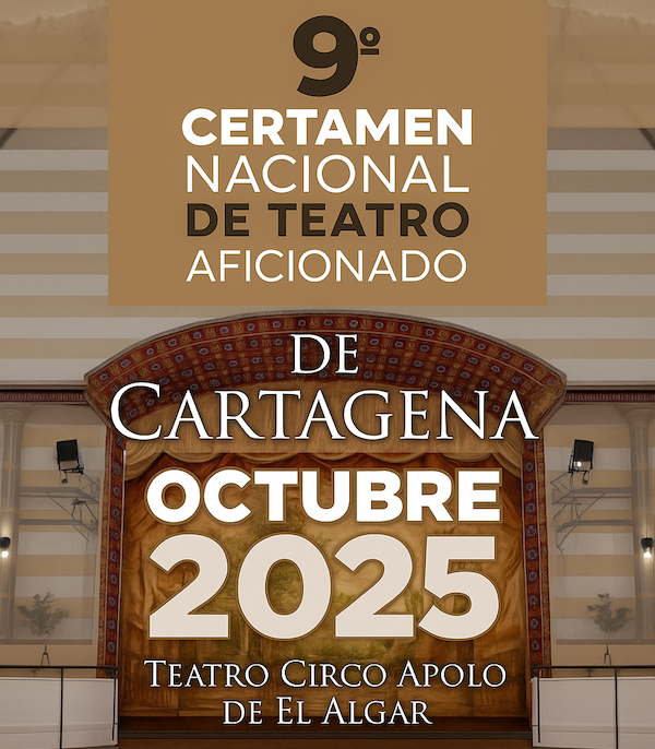 Últimos días para participar en el IX Certamen Nacional de Teatro de Cartagena, el evento organizado por la Asociación Sociocultural Teatro Circo Apolo de El Algar, con la colaboración de La Pecera Actividades Culturales, la Compañía Teatro Apolo y Cultura del Ayuntamiento de Cartagena. El plazo de inscripción finaliza el próximo 24 de agosto y las solicitudes se realizan a través del email Esta dirección de correo electrónico está siendo protegida contra los robots de spam. Necesita tener JavaScript habilitado para poder verlo.