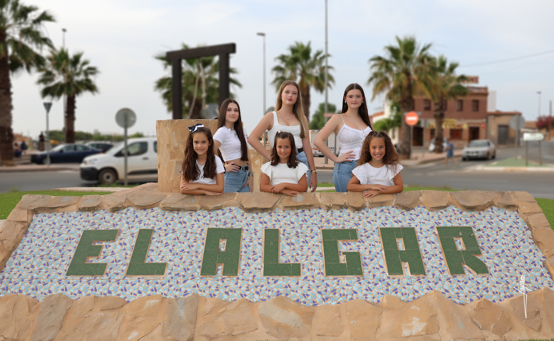 La fotografía muestra, de izquierda a derecha del lector, en la fila superior a Lucía Bueno Olmos, Alicia Martínez Pérez y Sofía Pérez Martínez, mientras que sentadas se observa a Mayte Gracia Martínez, Leyre Vera Vidal y Vega Martínez García. Son las candidatas a reinas y mises de la edición de 2025 de las Fiestas de El Algar, en las categorías juvenil e infantil, siendo este viernes noche cuando se producirá la votación, para el sábado tener lugar la gala de coronación.