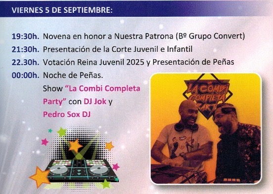 Primera jornada del programa festero, con presentación de la corte juvenil e infantil en el escenario ubicado frente al centro cívico, par a continuación tener lugar la votación para elegir a las reinas y misas juvenil e infantil, además de la presentación de las peñas de este año. Después, ya en la medianoche, música con el show 'la Combi Completa Party' con DJ Jok y Pedro Sox DJ.