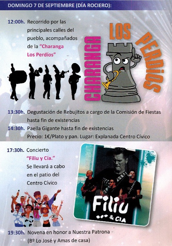 La charanga 'Los perdíos' recorrerá las calles dle pueblo antes de la degustación de rebujitos y de la convivencia en torno a un arroz gigante. Por la tarde es el turno para la música en directo de 'Filiu y Cía', quien esta pasada semana ha actuado en Alicante y en Tarrasa. Después, jornada novenaria en honor a la patrona por el barrio de Lo José y de las amas de casa. // Fútbol: CD Algar inicia la liga hoy recibiendo al Lorca Deportiva B