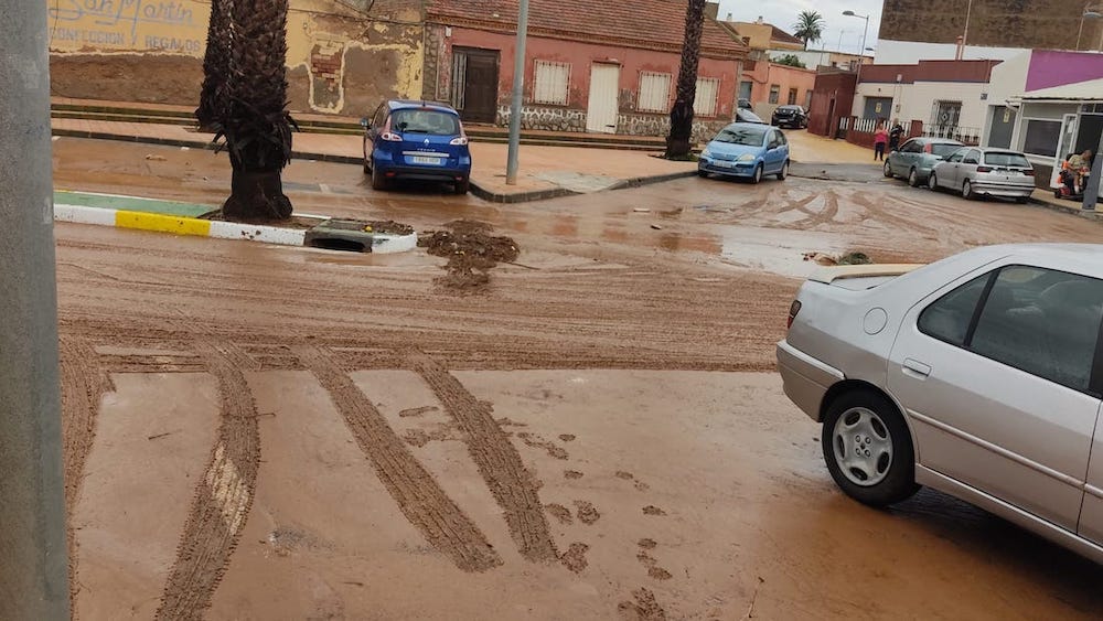 Aspecto que ofrece la plaza del Hondo de El Algar a media mañana de hoy como consecuencia del agua caída durante la madrugada y los arrastres procedentes de La Unión y de la sierra minera. El personal de limpieza municipal está actuando en la zona para tratar de que recupere su aspecto habitual cuanto antes. Las fotografías son aportadas por Juan Urrea Martínez.