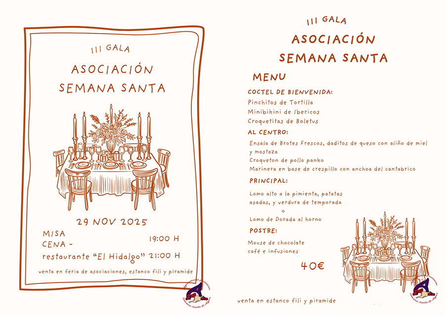 Tras la liturgia, los actos se trasladarán a los salones de "El Hidalgo", lugar en el que se amenizará la cena con intervenciones sobre nuestra asociación, reconocimientos y novedades para la próxima Semana Santa, entre los que destaca la adquisición de una imagen de Jesucristo resucitado para procesionar el próximo domingo de Resurreción.