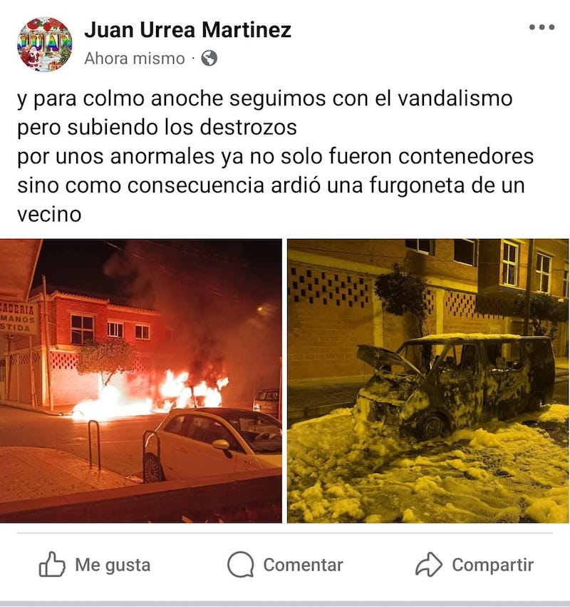 El vandalismo continúa en las calles del pueblo algareño por tercera noche consecutiva. A los 16 contenedores que ardieron las dos madrugadas anteriores, hay que ampliar la suma con los de anoche, que además provocaron que ardiera la furgoneta de un vecino.