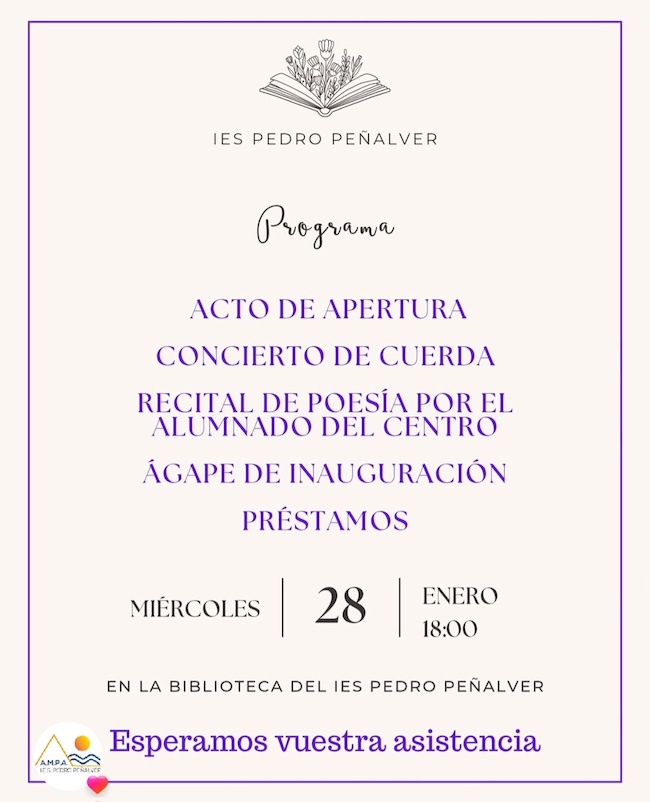 Hoy, coincidiendo con la festividad de Santo Tomás de Aquino, se inaugura en el IES Pedro Peñalver la iniciativa 'Biblioteca abierta' en un acto con estará enriquecido por un concierto de cuerda y un recital poético. Se trata de un proyecto que ha llevado a cabo el centro en colaboración con el AMPA y varias asociaciones de la localidad, destinado a promover la lectura, no solo entre el alumnado, sino también en familias y vecinos, poniendo a su disposición un fondo bibliográfico de más de cinco mil volúmenes.