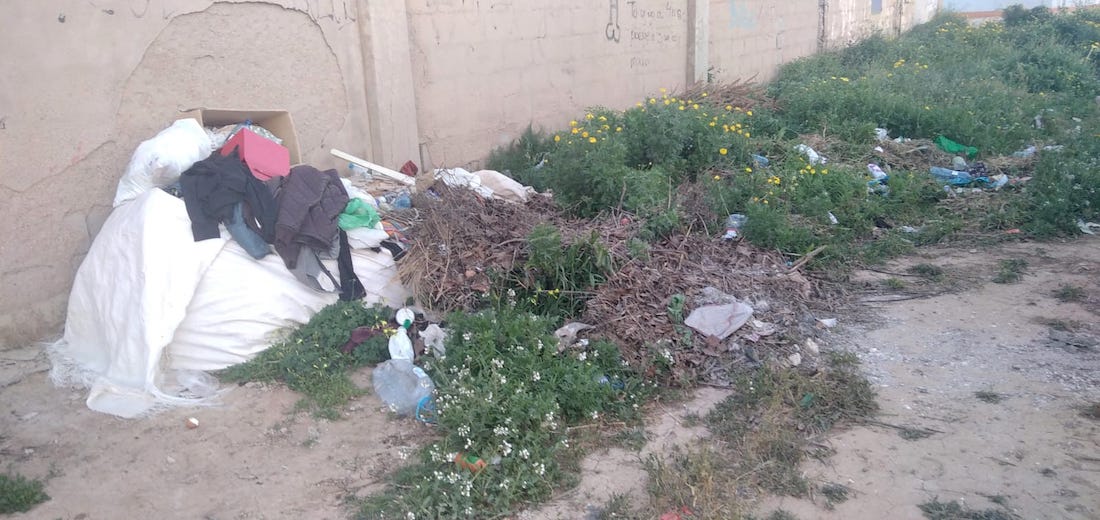 Situada junto al campo de fútbol del Sánchez Luengo de El Algar, está sirviendo como basurero por parte de aquellos que pierden la conciencia del mundo en el que viven. Las fotografías muestran la acumulación de basura en diversas zonas, incluidas las que dan a las paredes del recinto deportivo. Ropa, zapatos, colchones y toda clase de porquería que se mezclan con la maleza.
