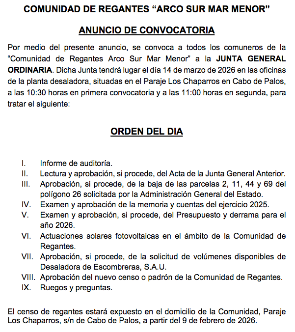 Junta general de los regantes de ‘Arco Sur Mar Menor’
