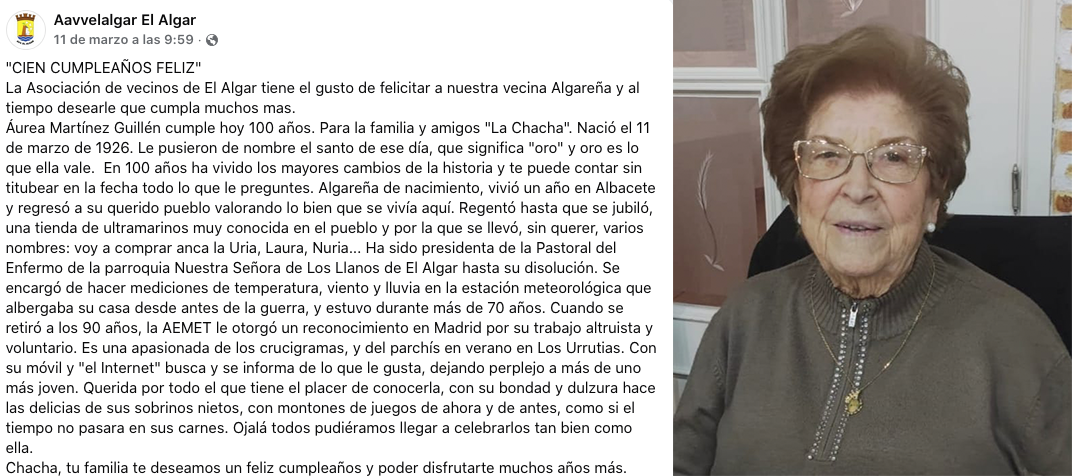 La Asociación de Vecinos de El Algar da a conocer que Áurea Martínez Guillen, vecina del pueblo y apodada 'La Chacha', cumplió el 11 de marzo cien años de edad.
