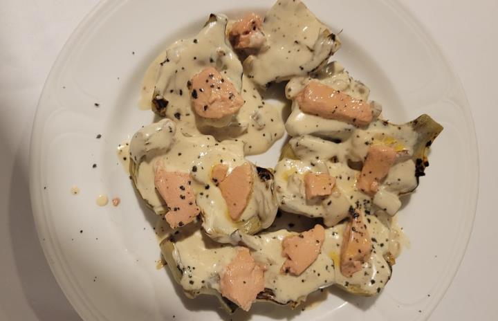 Comenzaron con unos entrantes de ensalada de escarola y apio con alcachofas encurtidos; crujientes de alcachofas con miel que estuvieron «de chuparse los dedos» y unas alcachofas con foie con una salsa de rebañar el plato con el sopeteo. Después pasaron a un canelón de pollo de corral con alcachofas que estuvo soberbio. El camarero Miguel Ángel les sorprendió con un cortante de sorbete de alcachofas. El segundo plato fue un guiso de alcachofas con bacalao y ajos tiernos, un «platazo de sabor». Todo regado con el nuevo vino del Campo de Cartagena Señorío de la Cámara, cepa vieja de 14,5% en nariz muy aromática y, en boca, estructurado y vigoroso. El postre consistió en una Creme Brulee y unos asiáticos cantonales.