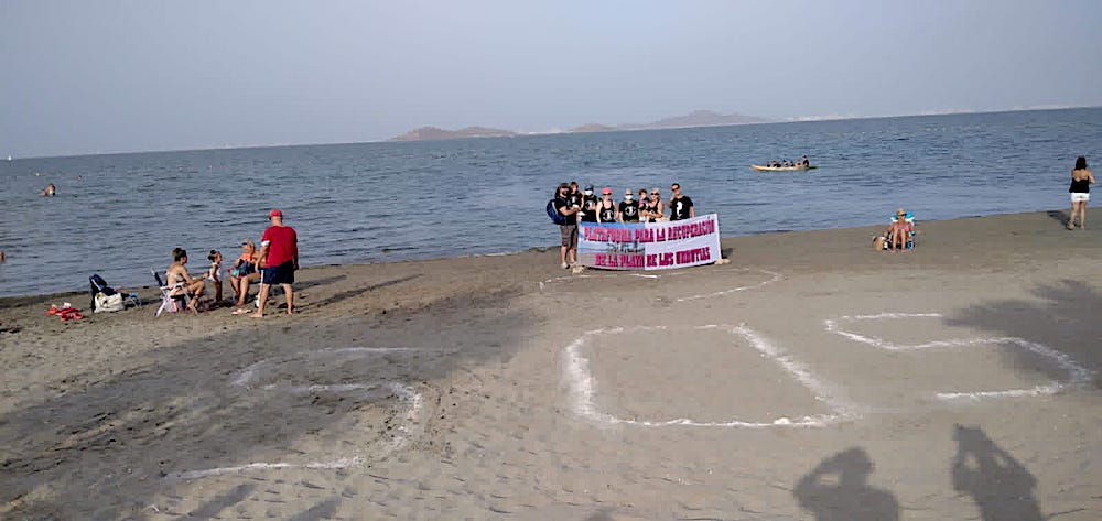 Esta tarde se han celebrado una macromanifestación para reclamar soluciones para la ‘laguna salada’ con 18 actuaciones en playas que la rodean, entre las que ha figurado la urrutiense, la más perjudicada por su mal estado. También ha participado una avioneta con un mensaje y pasadas por estos enclaves.