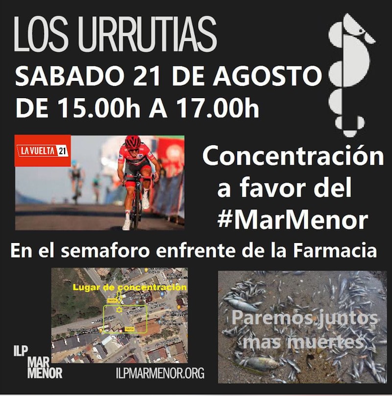 Coincidiendo con el quinto día en el que aparecen  cuerpos sin vida de miles de ejemplares de especies marinas en playas del Mar Menor, se han convocado en Los Nietos, Los Urrutias, La Manga y Los Alcázares concentraciones para, de forma pacífica, aprovechar la presencia de las cámaras de televisión que cubren la octava etapa de la gran ronda ciclista española para difundir la necesidad de soluciones urgentes para la albufera. Convoca la plataforma ILP Mar Menor, que trabaja para recoger medio millón de firmas que den entidad jurídica a la ‘laguna salada’ mediante una iniciativa legislativa popular.