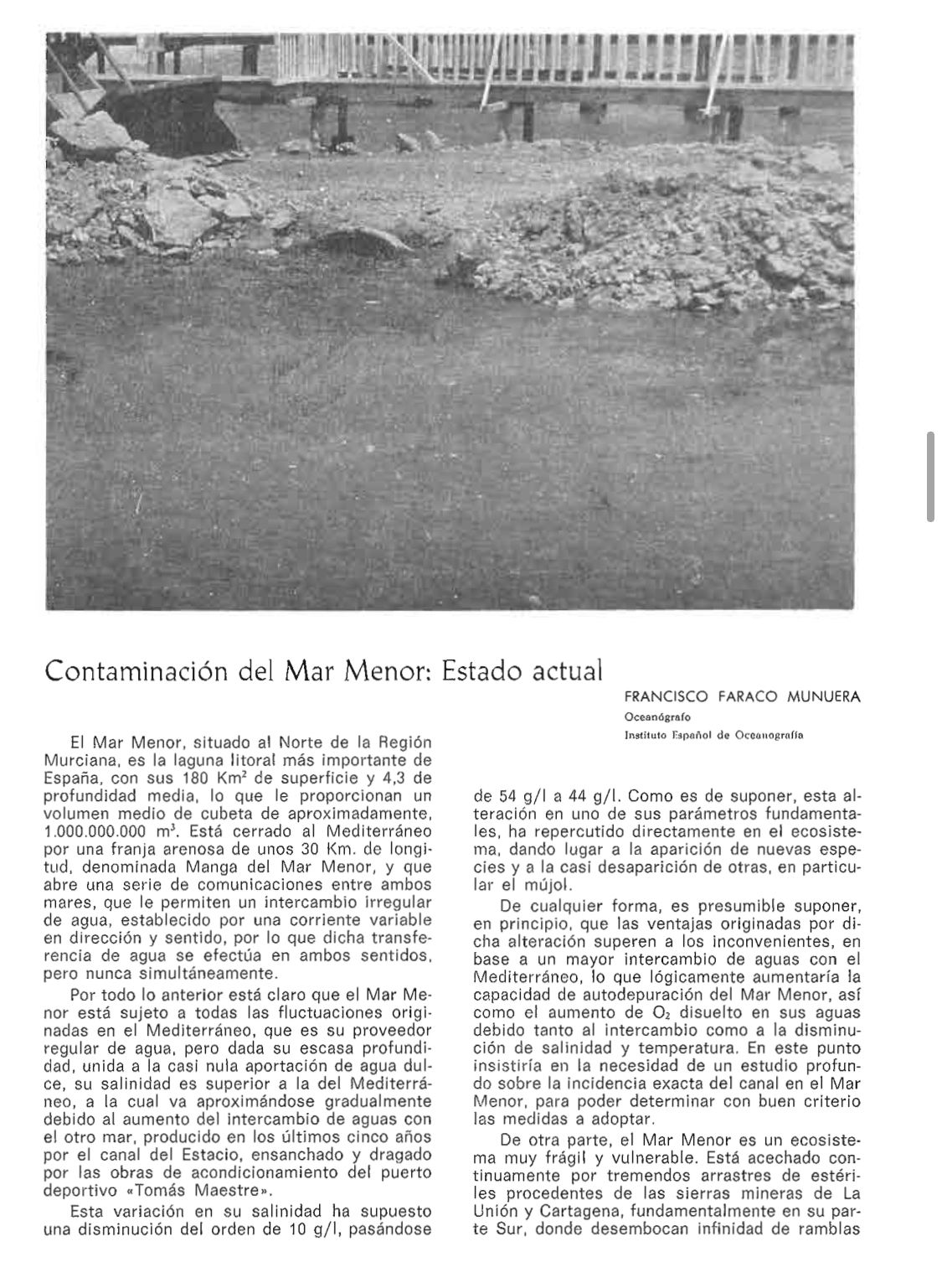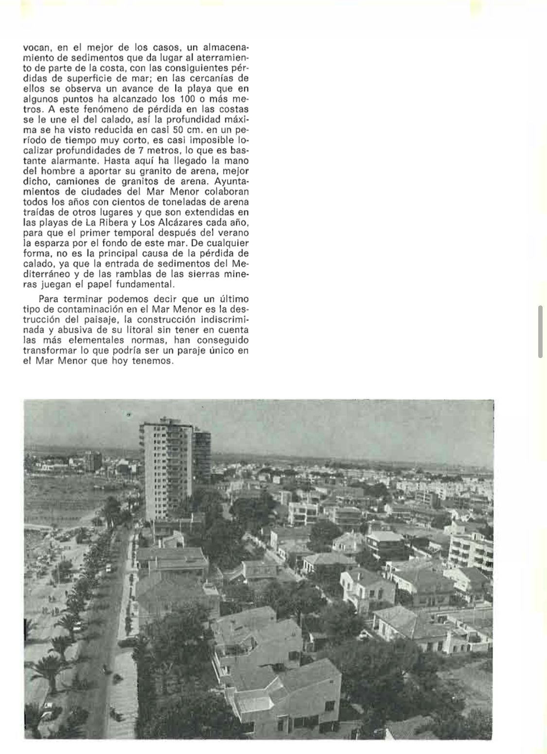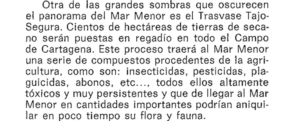 En el artículo se destacaba la muy intensa transformación urbana debido a la promoción turística, pero no siempre con las infraestructuras necesarias. También se reseñaba que se habían puesto en regadío "más de treinta mil hectáreas terrenos que rodean la laguna", indicando que era urgente acometer actuaciones "tendentes a evitar la contaminación de la laguna" con la pretensión de que los vertidos y las aguas residuales "no fueran a parar al mar". El entonces director general de Recursos Hidraúlicos de la Comunidad Autónoma, en una entrevista, indicaba que una vez que el Plan de Saneamiento Integral del Mar Menor sea aprobado "no atenderá sólo vertidos urbanos, sino también medidas tendentes a impedir la contaminación por los vertidos de usos agrícolas, ganaderos y mineros". Se decía que la idea es que este plan estuviera terminado para 1991.