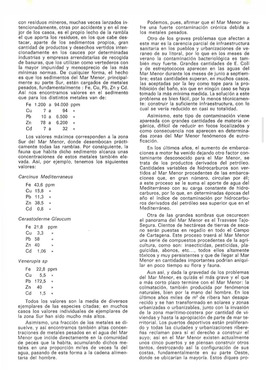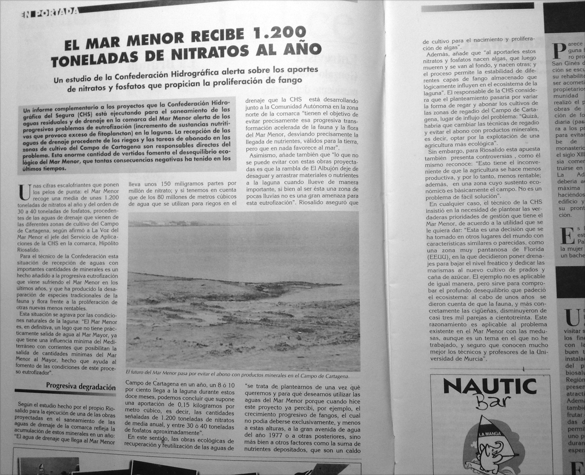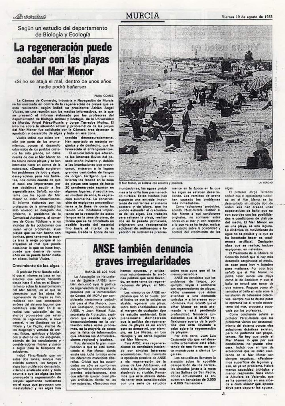 En el artículo se destacaba la muy intensa transformación urbana debido a la promoción turística, pero no siempre con las infraestructuras necesarias. También se reseñaba que se habían puesto en regadío "más de treinta mil hectáreas terrenos que rodean la laguna", indicando que era urgente acometer actuaciones "tendentes a evitar la contaminación de la laguna" con la pretensión de que los vertidos y las aguas residuales "no fueran a parar al mar". El entonces director general de Recursos Hidraúlicos de la Comunidad Autónoma, en una entrevista, indicaba que una vez que el Plan de Saneamiento Integral del Mar Menor sea aprobado "no atenderá sólo vertidos urbanos, sino también medidas tendentes a impedir la contaminación por los vertidos de usos agrícolas, ganaderos y mineros". Se decía que la idea es que este plan estuviera terminado para 1991.