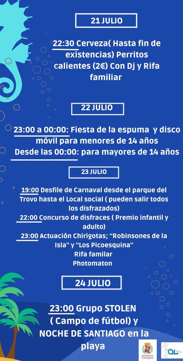 El programa de las fiestas ‘Del Carmen a Santiago’ que organiza la asociación de vecinos celebra esta noche la ‘Fiesta de la cerveza’ en la terraza del local social, para mañana ser la espuma la protagonista en el mismo marco. El sábado, desfile de disfraces que contará con la participación de la comparsa algareña Hondonada y velada con actuaciones de los grupos cartageneros que han conseguido el primer y el tercer premio del concurso regional de chirigotas del reciente Carnaval de Cartagena, respectivamente, ‘Los robinsones de La Isla’ y ‘Los picoesquina’.