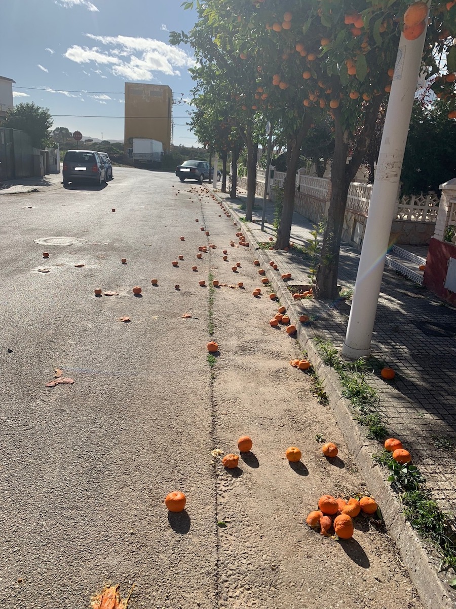 "Es una verg眉enza. Si se ponen estos naranjos bordes, hay que prever la recogida de su fruto cuando cae y evitar tanta acumulaci贸n. Es vergonzoso", expone en el escrito remitido, que acompa帽a de fotograf铆as muy expresivas, que corroboran su denuncia.