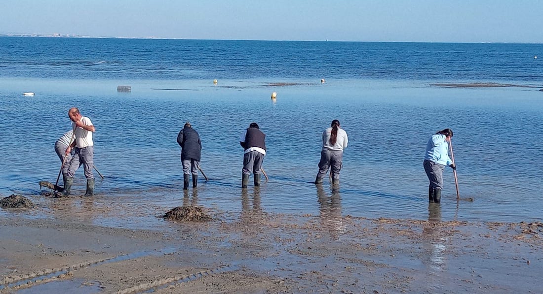 Fotoshock captada esta mañana de de una jornada más con la brigada de limpieza retirando lodos y algas de la playa de Los Urrutias.