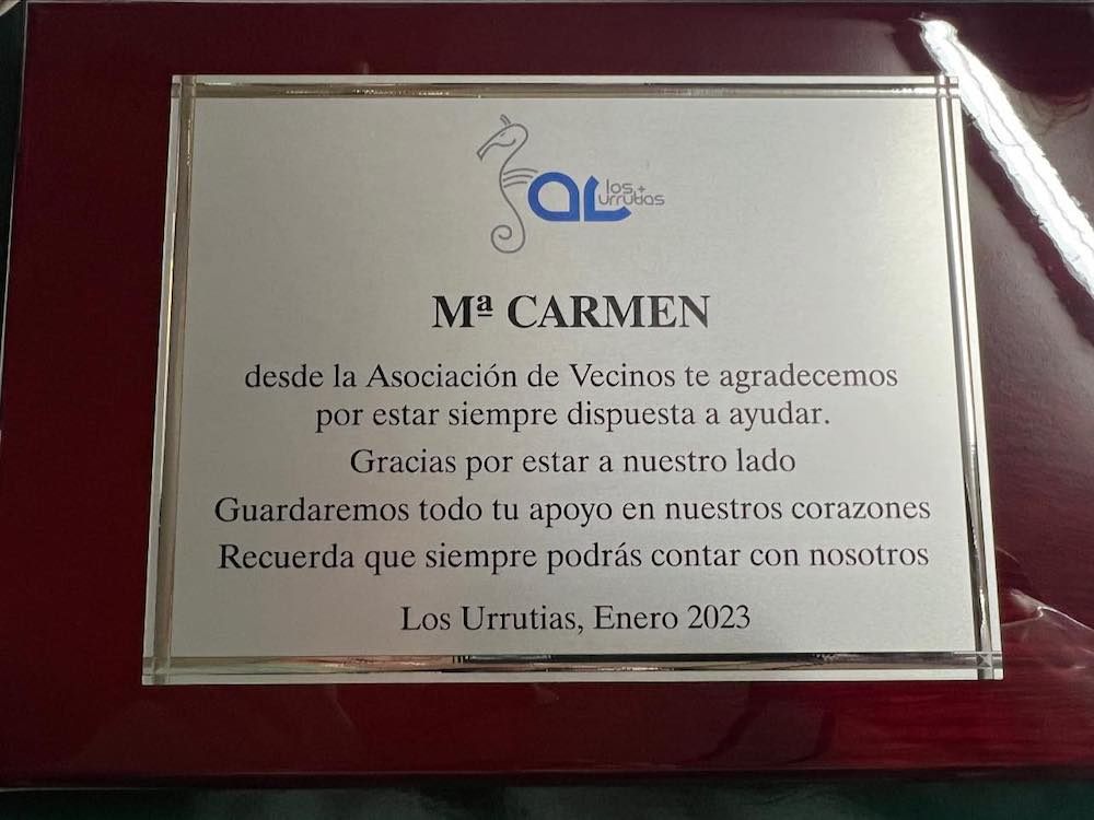 La Asociación de Vecinos de Los Urrutias ha entregado una placa de gratitud a Maricarmen, quien se traslada a Mazarrón para cuidar mejor a su madre, "por todo lo que ha hecho de manera altruista por este pueblo".