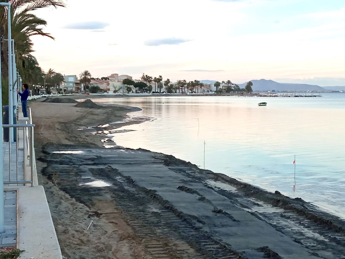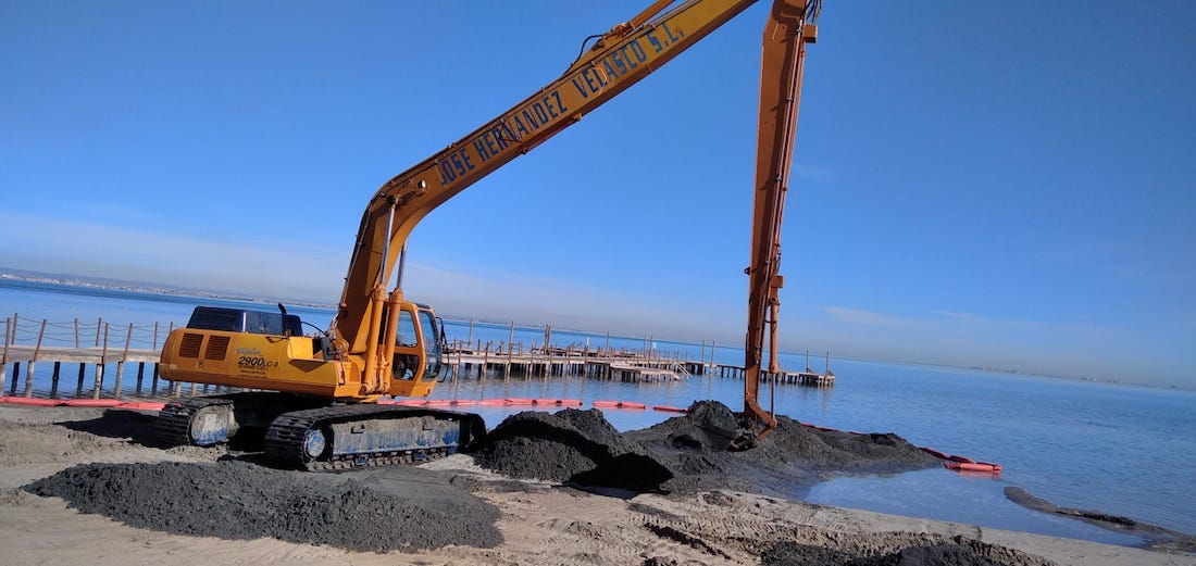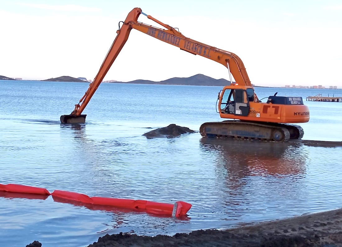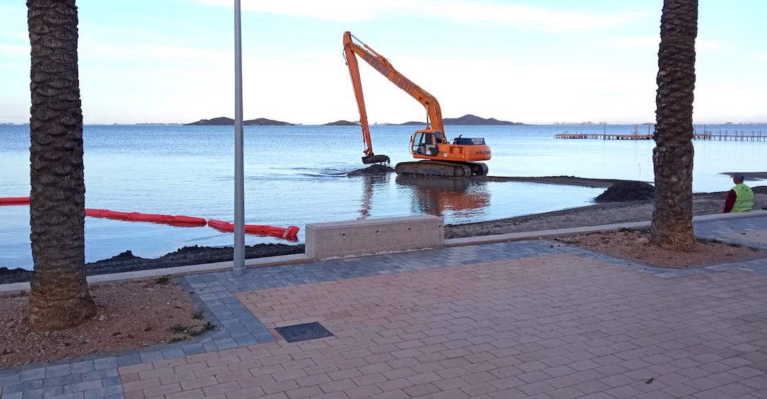 Durante estos días hay una máquina trabajando en la playa de Los Urrutias con labores de sacar arena del agua para que aumente la profundidad, para después colocarla en el arenal. De esta forma, se trata de subsanar los efectos del desplazamientos generados en los últimos meses por las lluvias y temporales.