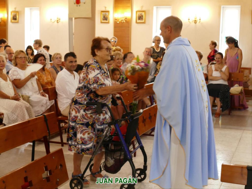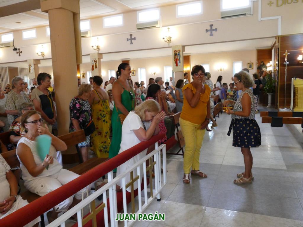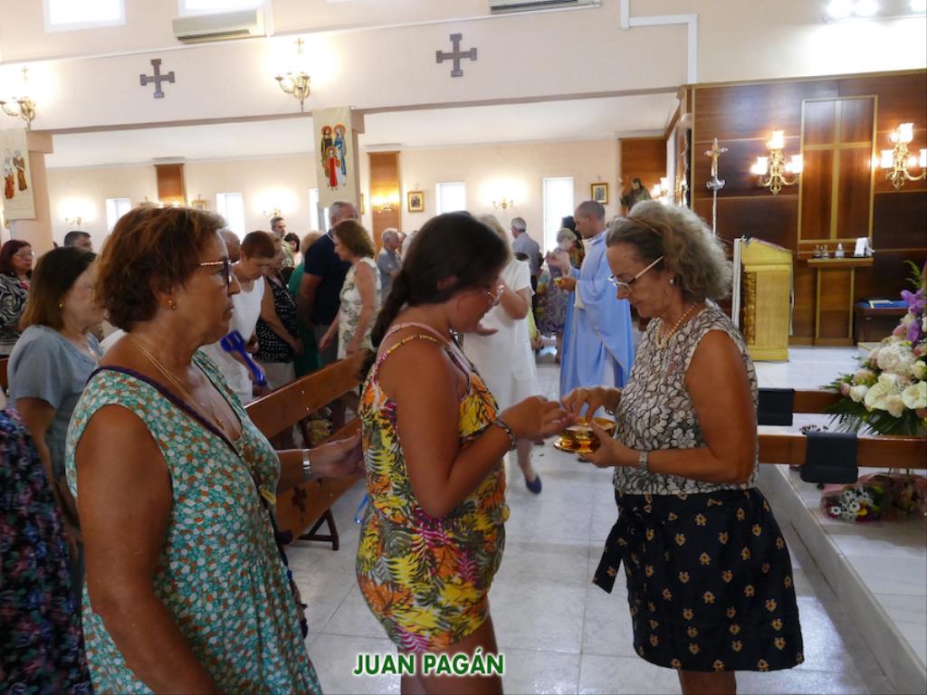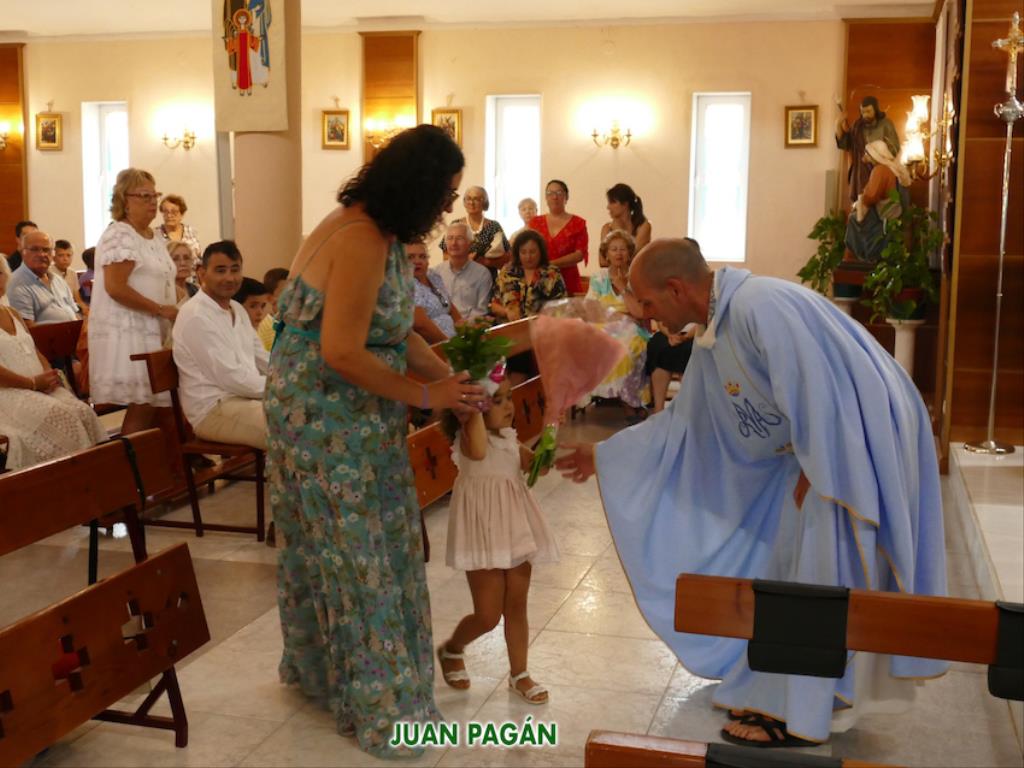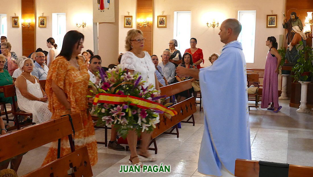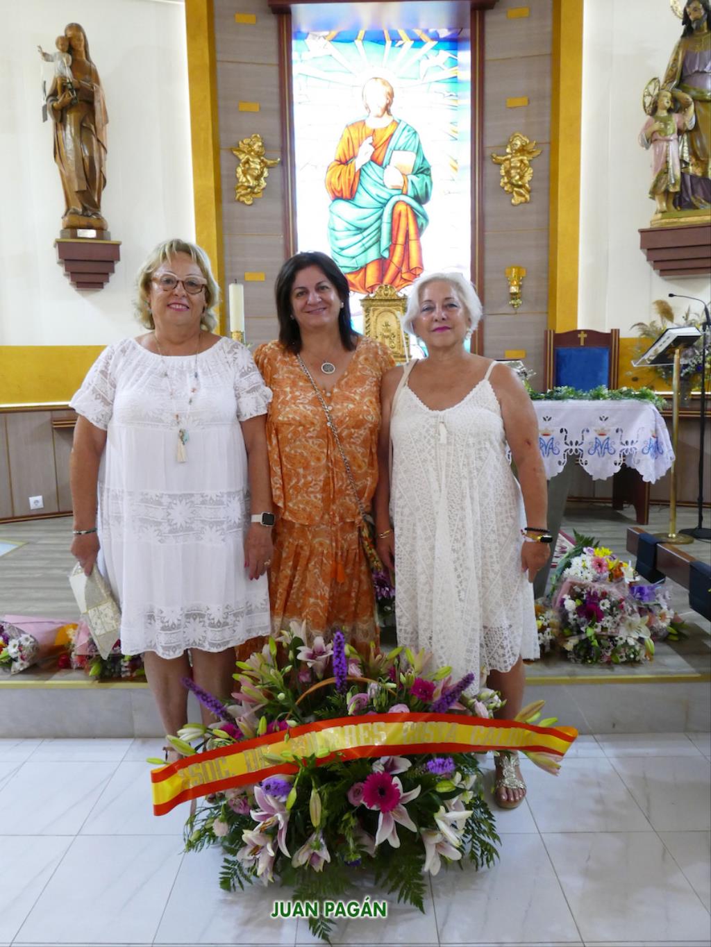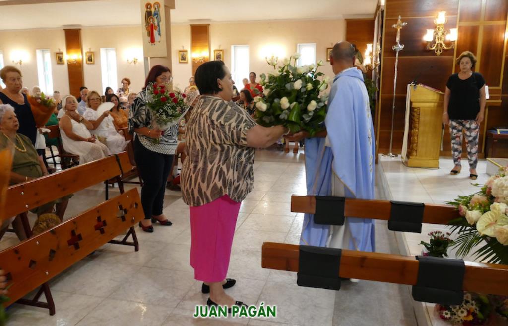 El gran día de la patrona de Los Urrutias ha tenido un primer capítulo matinal con la eucaristía que ha oficiado el parróco, Antonio Guillén, en la iglesia ante unas doscientas cincuenta personas. En la foto, la asociación de amas de casa con la bonita ofrenda de una cesta de flores con la cinta de la enseña nacional. GALERÍA DE FOTOS (pinchar aquí)