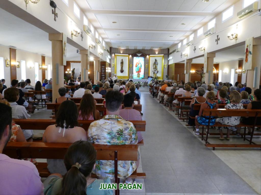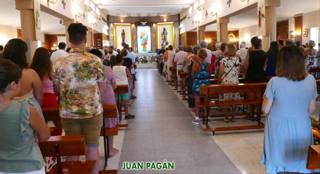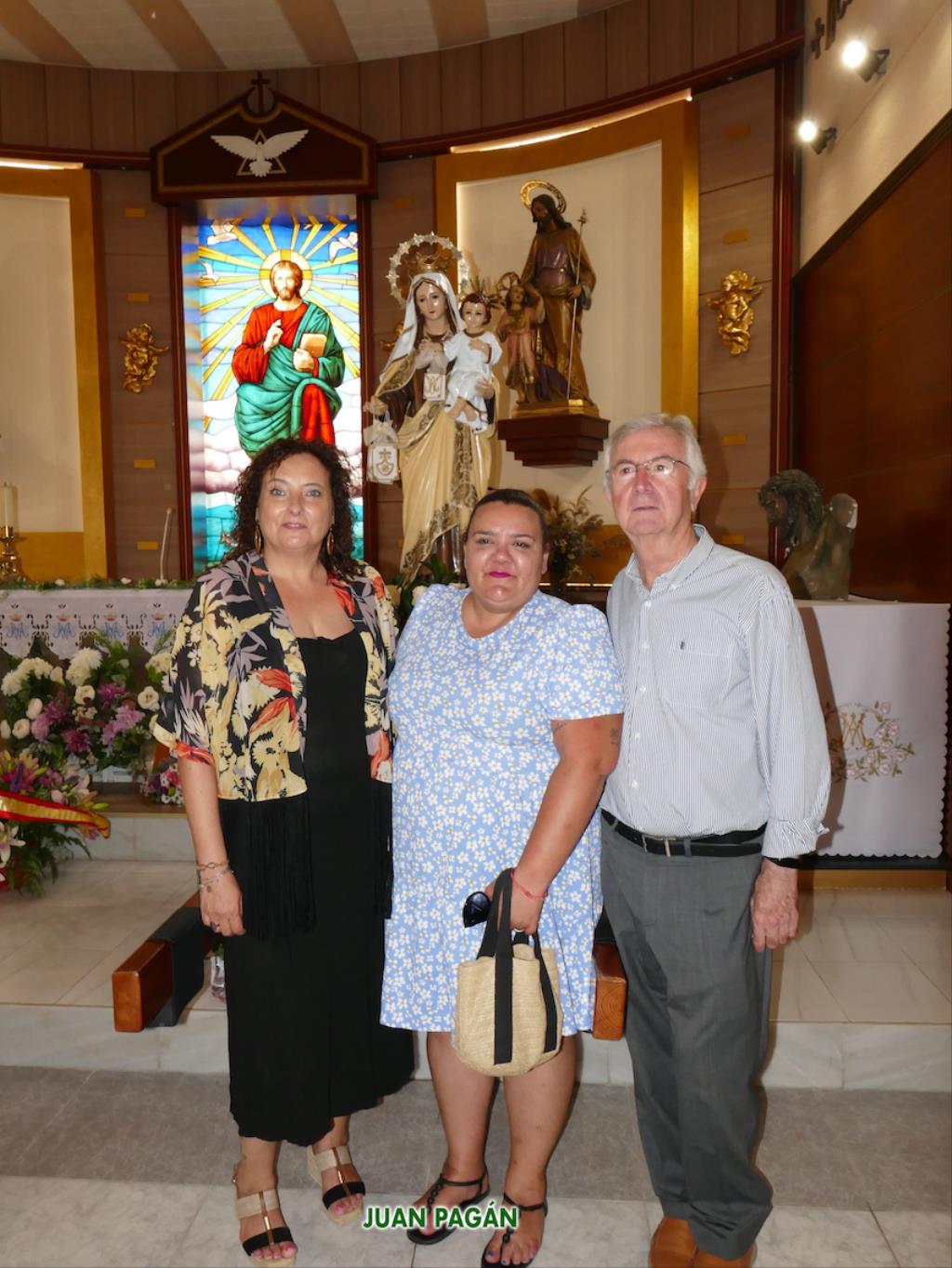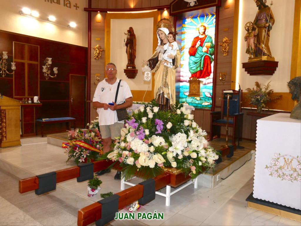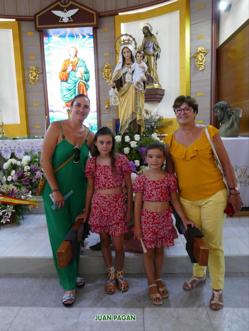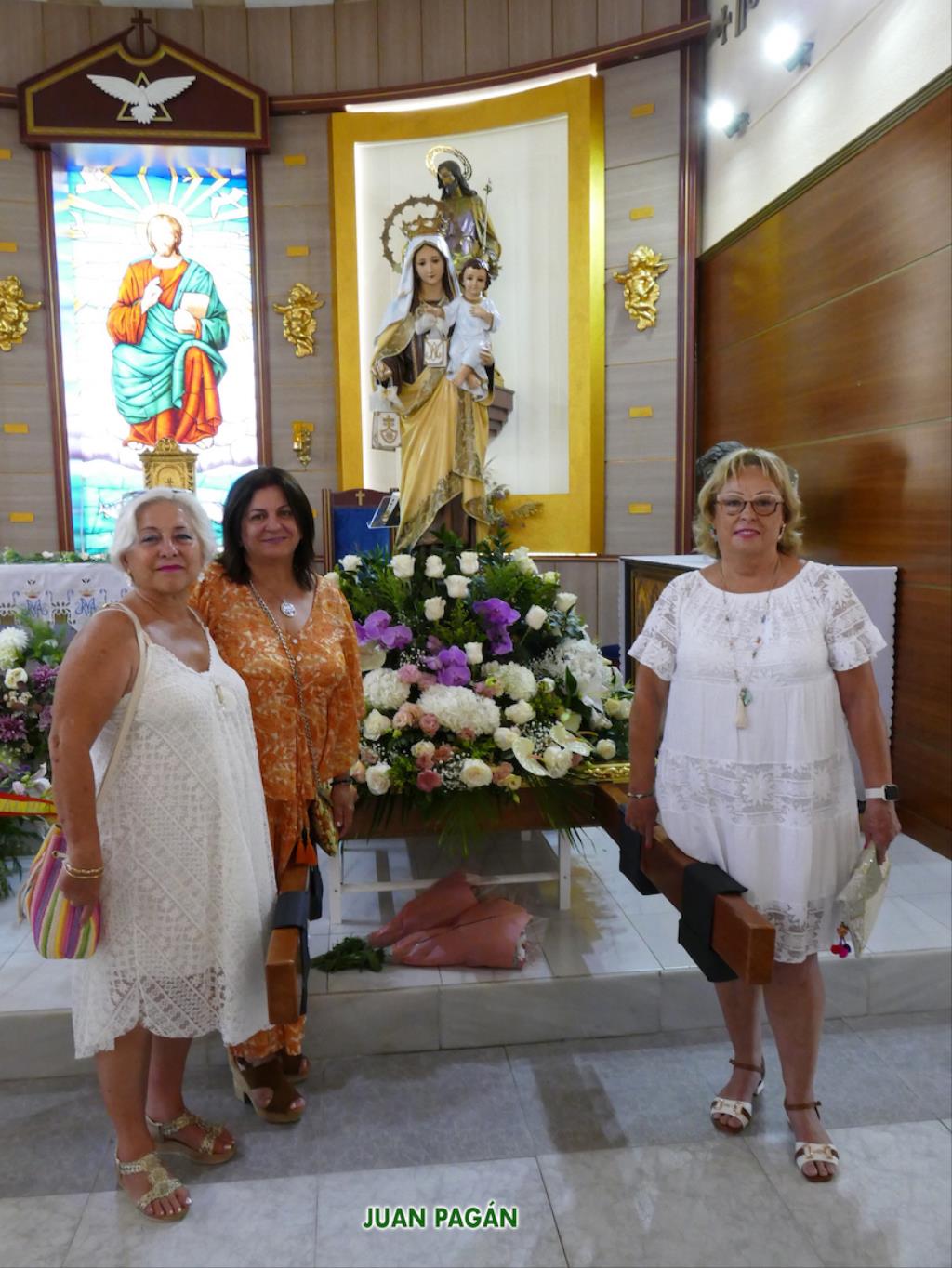 El gran día de la patrona de Los Urrutias ha tenido un primer capítulo matinal con la eucaristía que ha oficiado el parróco, Antonio Guillén, en la iglesia ante unas doscientas cincuenta personas. En la foto, la asociación de amas de casa con la bonita ofrenda de una cesta de flores con la cinta de la enseña nacional. GALERÍA DE FOTOS (pinchar aquí)