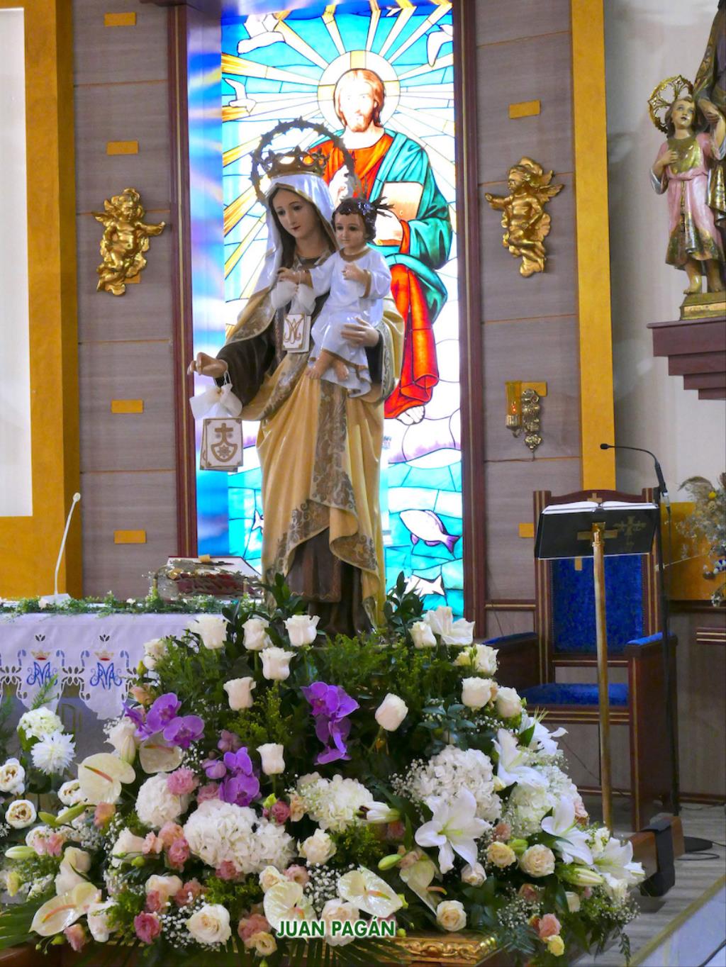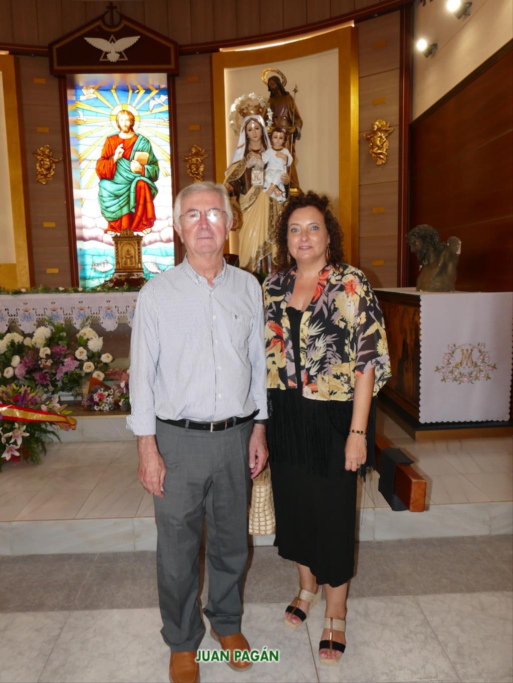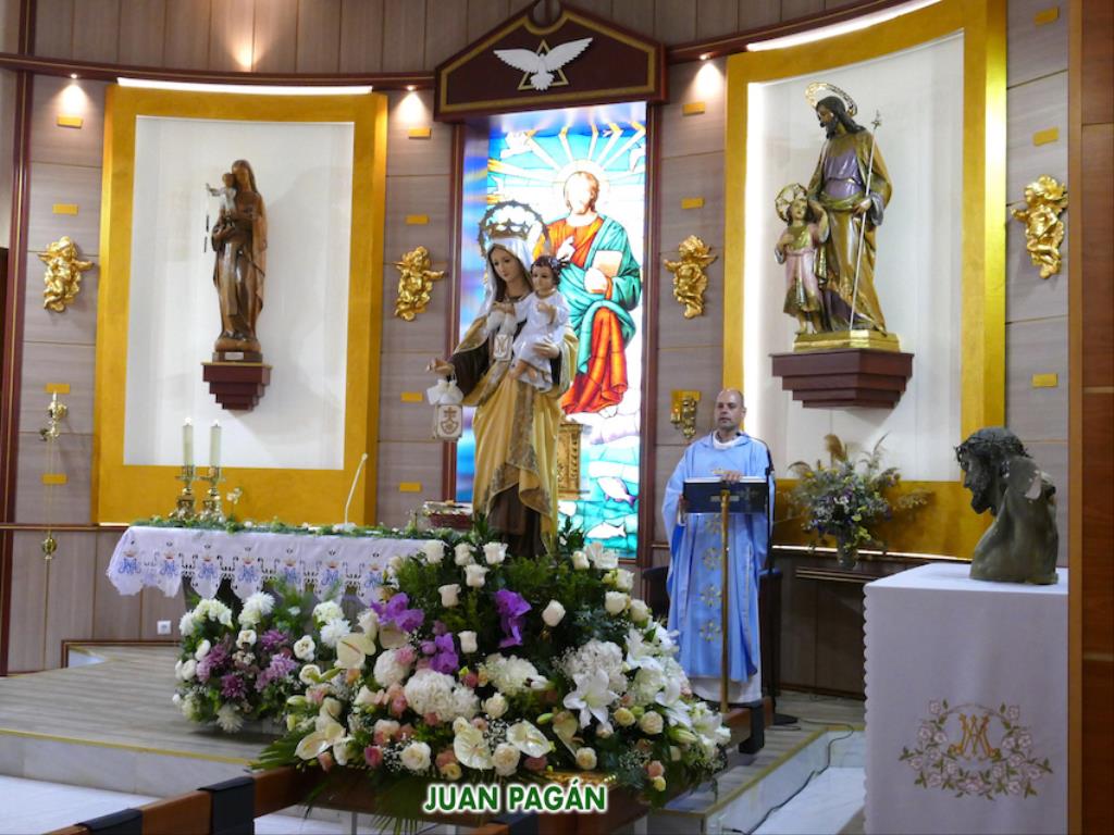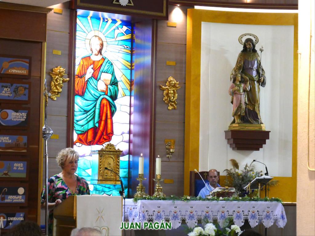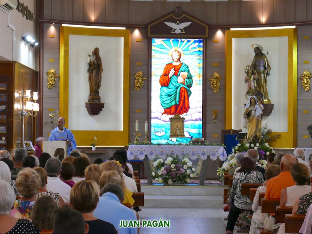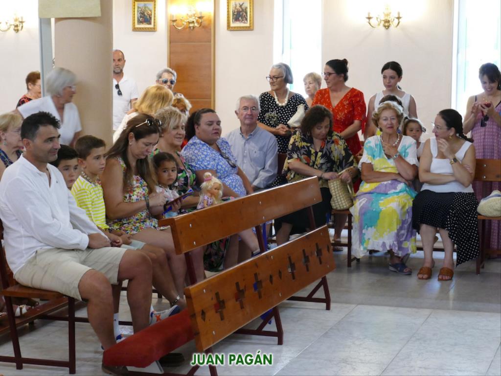 El gran día de la patrona de Los Urrutias ha tenido un primer capítulo matinal con la eucaristía que ha oficiado el parróco, Antonio Guillén, en la iglesia ante unas doscientas cincuenta personas. En la foto, la asociación de amas de casa con la bonita ofrenda de una cesta de flores con la cinta de la enseña nacional. GALERÍA DE FOTOS (pinchar aquí)