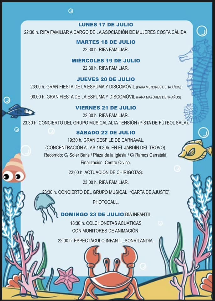 El programa de actos preparado por la asociación de vecinos para esta semana, además de rifas familiares diarias, incluye la fiesta de la espuma, el desfile de disfraces, el espectáculo infantil ‘Sorrilandia’ y las actuaciones de chirigotas de de los grupos de música ‘Alta tensión’ y ‘Carta de ajustes’.