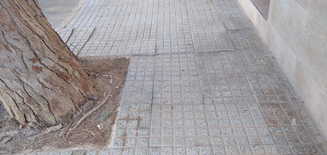 Los vecinos de esta calle Soler Bans de Los Urrutias han puesto unos carteles en los troncos de los pinos para avisar a los viandantes del peligro que existe en la baldosas por tener losas levantes, con lo que es latente el riesgo tropezones u otro tipo de accidente, pues está el precedente de hace unos años cuando uno de estos árboles cayó por completo.
