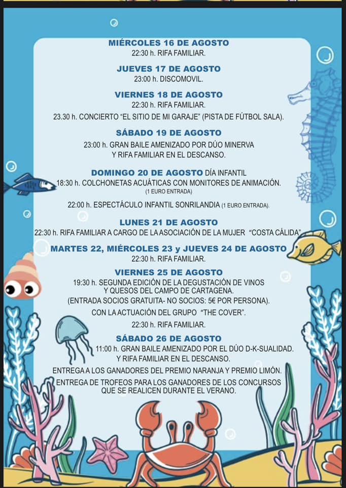 El programa de fiestas del verano organizado por la Asociación de Vecinos de Los Urrutias continúa, ofreciendo en los próximos diez días, entre otras propuestas, dos veladas de música en directo, el espectáculo infantil 'Sonrrilandia', la degustación de vinos y quesos del Campo de Cartagena y la entrega de los premios 'Naranja' y 'Limón'. El lunes 23 también habrá una fiesta ibicenca en la terraza del local social (23 horas).