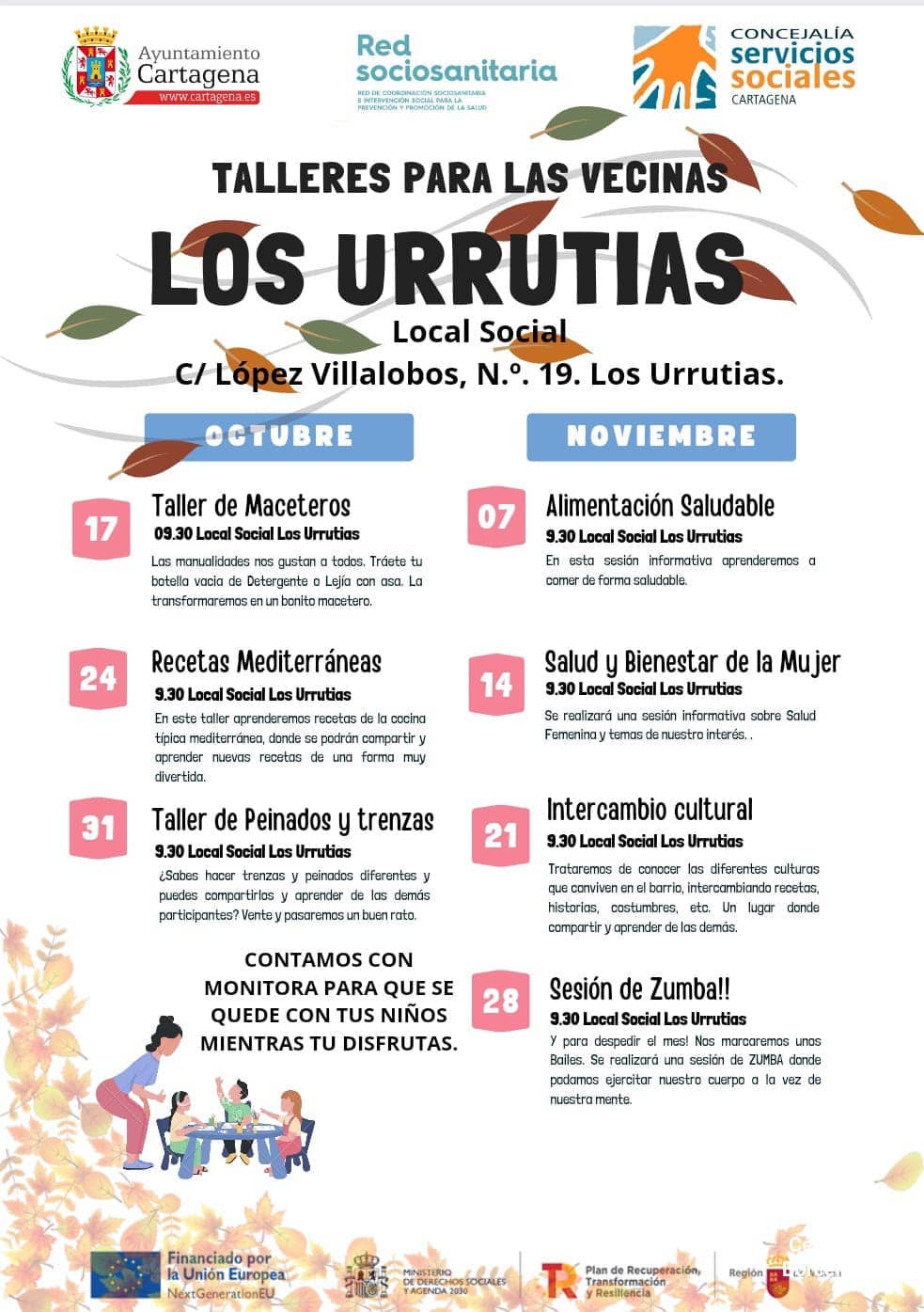 El local social de Los Urrutias acoge estas actividades desde el martes próximos y hasta el 28 de noviembre, siendo las temáticas maceteros, recetas mediterráneas, peinas y trenzas, alimentación saludable, salud y bienestar de la mujer, intercambio cultural y zumba.