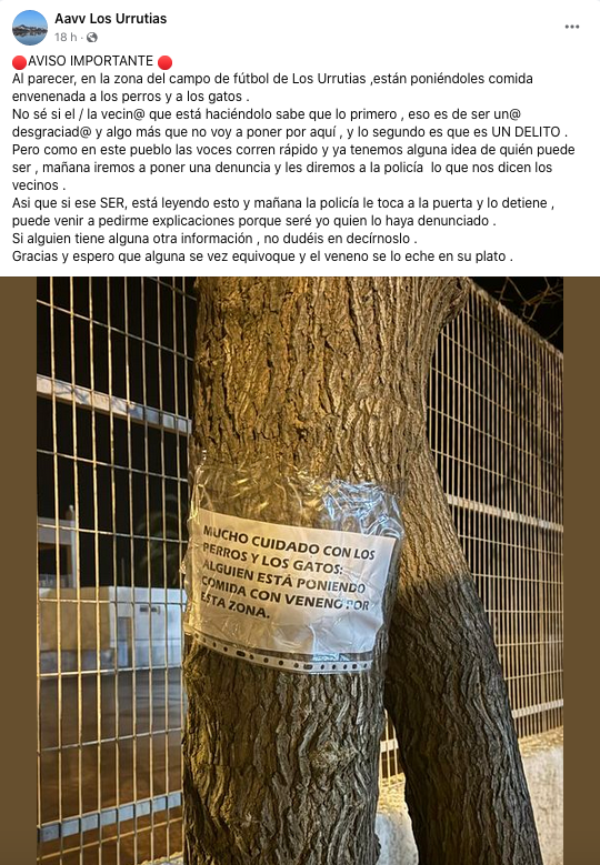 La Asociación de Vecinos de Los Urrutias ha publicado en su perfil de Facebook que en la zona del campo de fútbol están poniendo comida envenenada para perros y gatos, indicando que creen saber de quien se trata y que pondrá una denuncia.