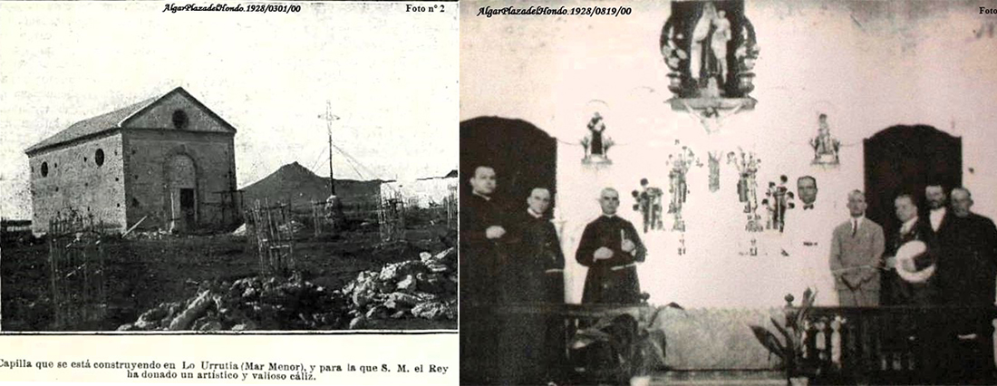 El perfil de Facebook 'Algar Plaza del Hondo' recuerda el orgien de la iglesia de Los Urrutias, que fue construida en 1928 sobre un solar donado el año anterior por Jerónimo Ros Espín. SSMM el Rey de entonces, Alfonso XIII, regaló un artístico cáliz de oro y plata para la capilla mientras se acometía la obra.