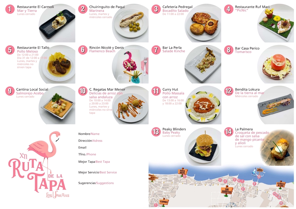 Restaurante El Carmolí, Chiringuito de Paqui, Cafetería Pedregal, Restaurante Ruf-Mari, El Tallo, Rincón Nicolé y Denis, La Perla, Casa Perico, cantina del Local Social, Club de Regatas Mar Menor, Curry Hut, Bendita Lokura, Peaky Blinders y La Palmera son las 14 escalas de Los Urrutias, Estrella de Mar, Punta Brava y El Carmolí que ha fijado la rutapa surgida hace 14 años para su décimo segunda edición, en la que se mantiene el precio de 2023 con tapa y bebida por 3 euros, siendo novedad importante que serán 10 los ruteros completos que se llevarán premio en lugar de 3, como ha sucedido en ediciones anteriores. Se han editado 2.500 ruteros.