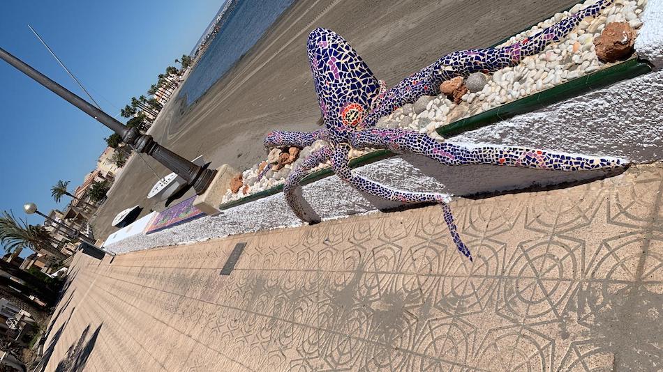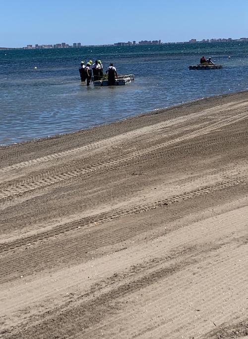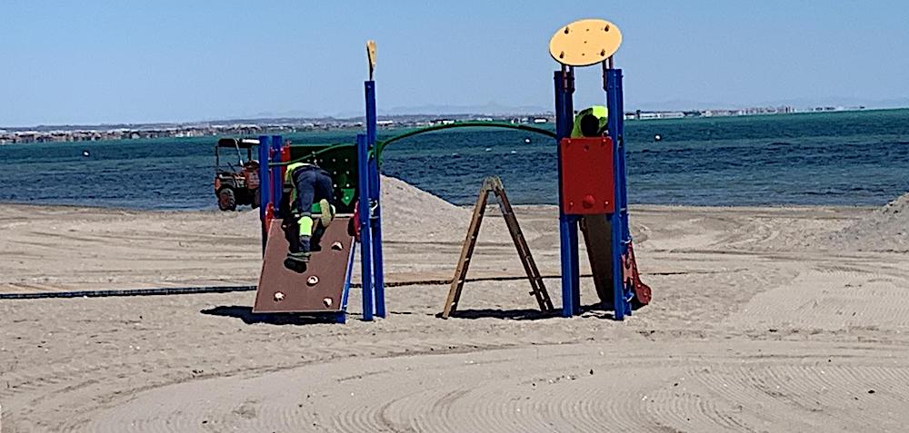 La playa de Los Urrutias está siendo objeto estos días del pintado de detalles del paseo marítimo y de la limpieza del arenal.