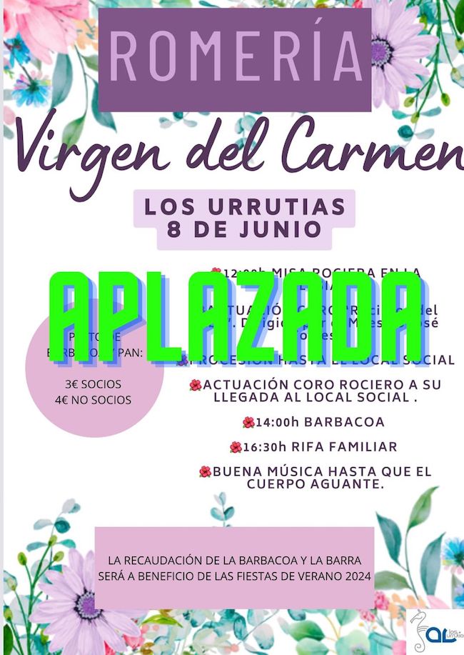"Sentimos comunicar que por motivos ajenos a la Asociación de Vecinos, nos vemos obligados a 'aplazar' la tradicional Romería de este sábado hasta nueva orden. Sentimos las molestias". Es el comunicado que el colectivo vecinal de Los Urrutias ha hecho público, añadiendo que sí habrá rifa familiar en el local social a las 19 horas.