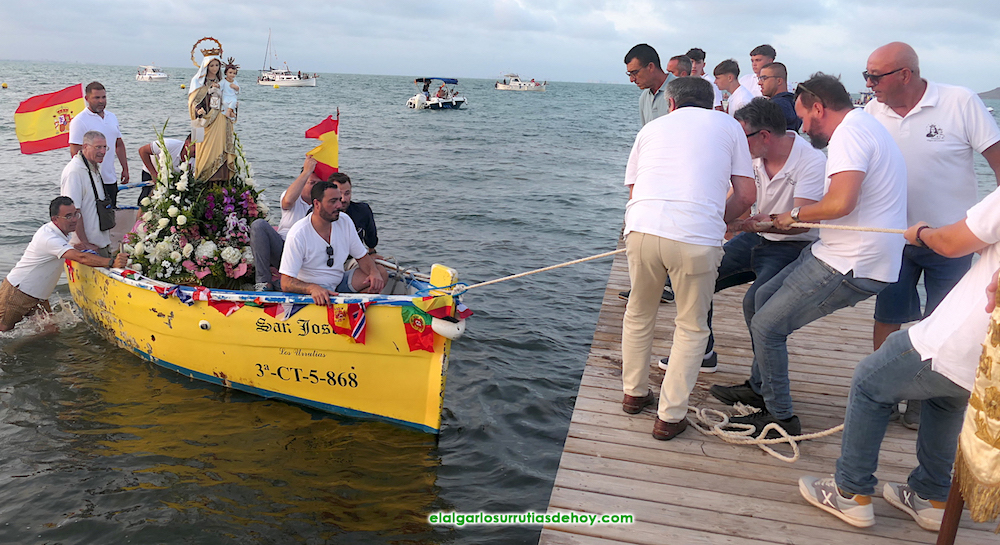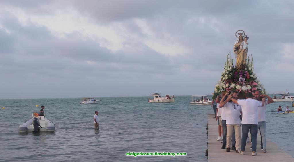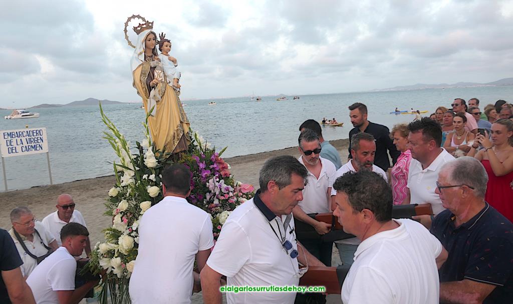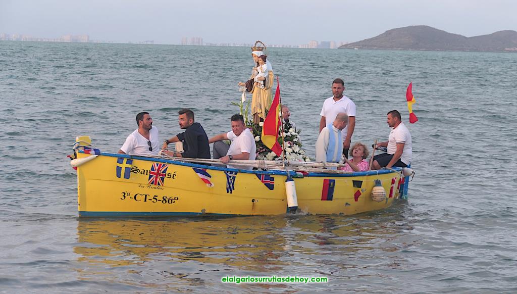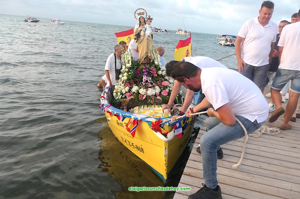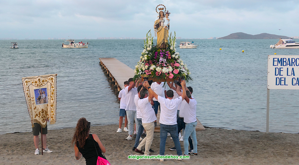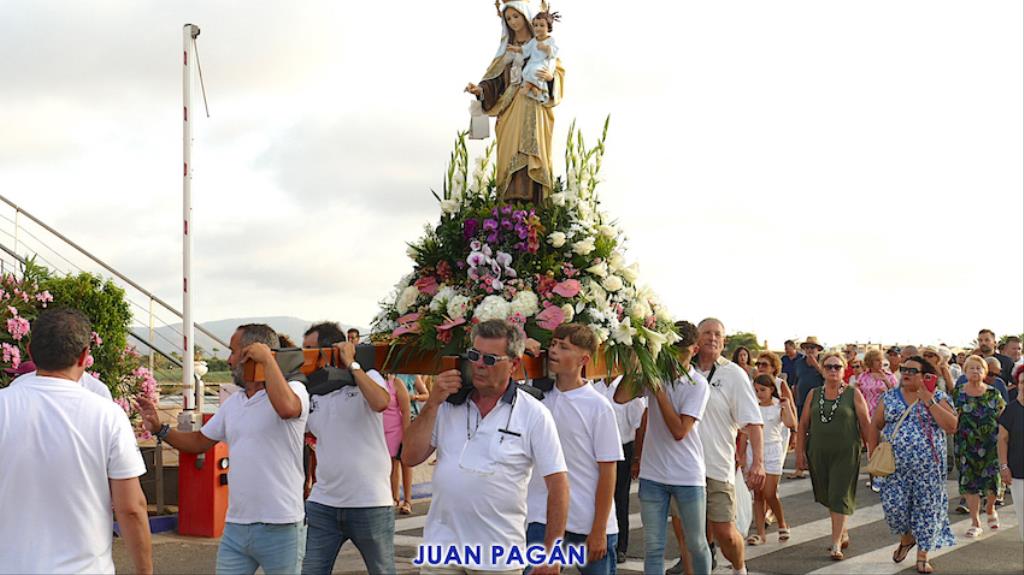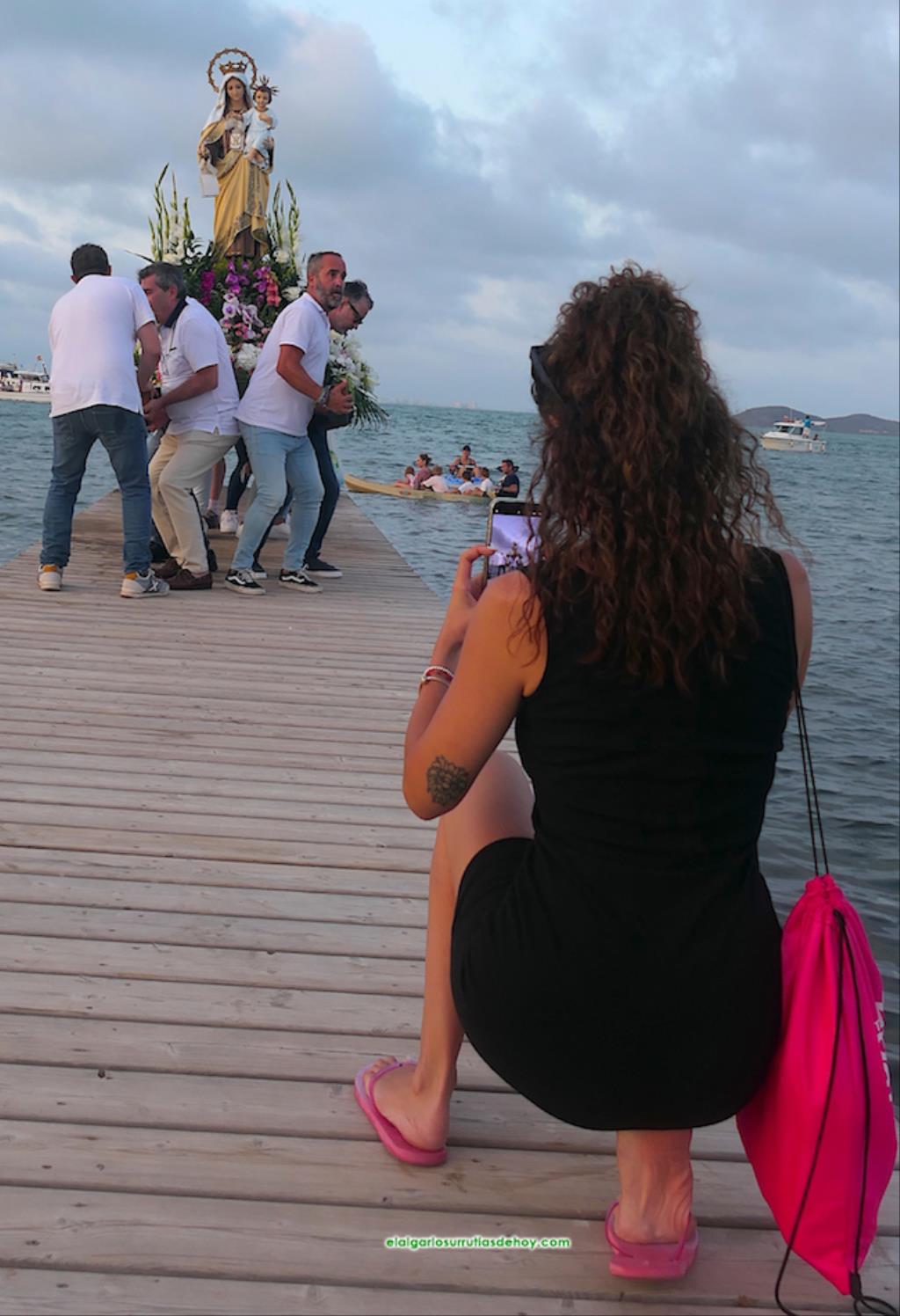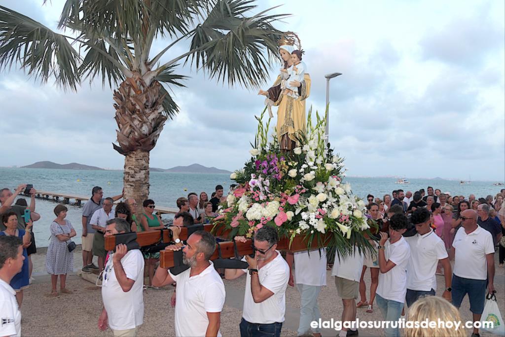 Después de la solemne misa en su honor y la primera parte de la procesión terrestre hasta que se embarcó en el club náutico de Los Urrutias, la imagen de Nuestra Señora del Carmen tardó en pasar al embarcadero de Punta Brava por las maniobras que hubo que llevar a cabo debido al mínimo calado, reanudando a continuación su 'paseo' por tierra hasta su templo sobre hombros rejuvenecidos por la incorporación de jóvenes.