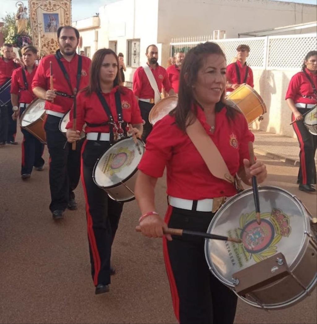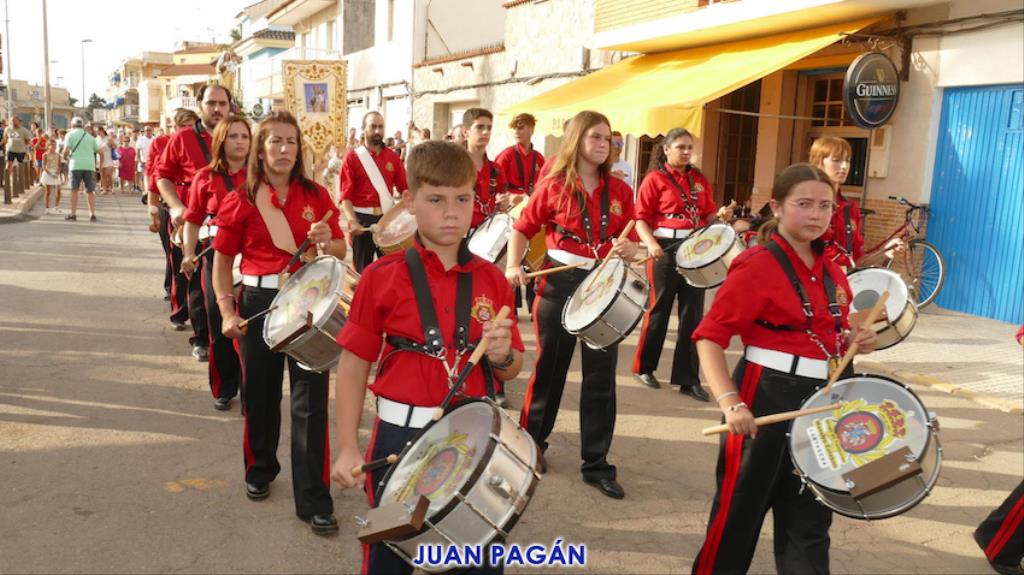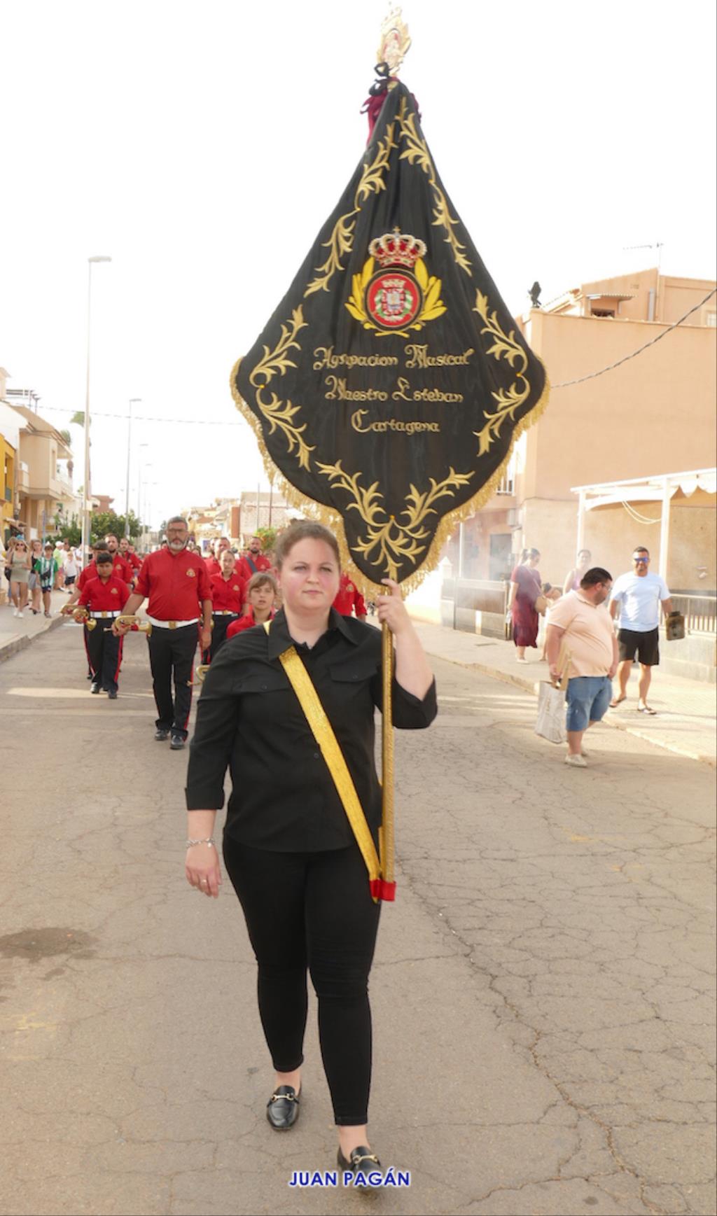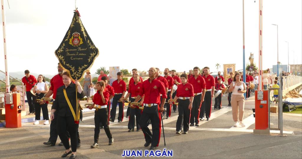 Después comenzó la procesión terrestre, en una comitiva que fue acompañada por el sonido que emitía la asociación de cornetas y tambores 'Trimilenaria Bahía de Cartagena' y en la que era novedad la presencia de cuatro jóvenes de unos quince años de edad cada uno entre el grupo de portapasos.