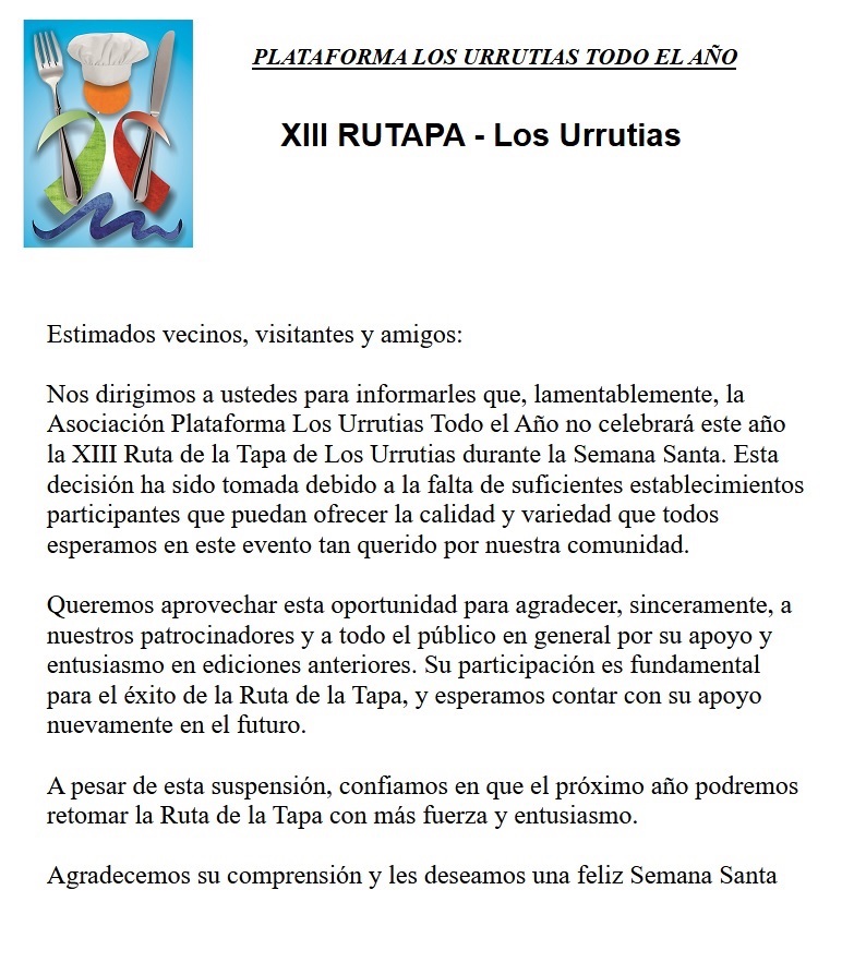 La plataforma 'Los Urrutias todo el año' emite un comunicado público en el que lamenta que este año no se celebrará la décimo tercera edición de esta popular senda del sabor que, pese a las buenas cifras de todos los años, en esta ocasión no cuenta con suficientes establecimientos participantes "que puedan ofrecer la calidad y variedad que todos esperamos en este evento tan querido por nuestra comunidad", indican, añadiendo el deseo de regresar en 2026.