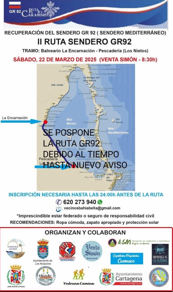 La Asociación de vecinos de El Algar informa que, debido al clima adverso, se ha decidido posponer la marcha entre Los Alcázares y Los Nietos que tiene como objetivo reclamar la recuperación del 'Sendero Mediterráneo'.