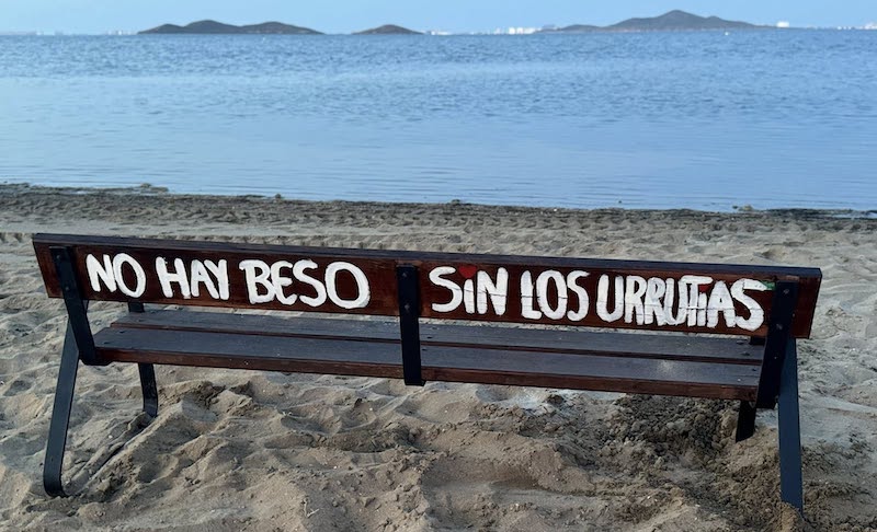La asociación de vecino difunde e invita a los internautas a fotografiarse en el banco de madera sobre el que se han escrito los mensajes 'No hay beso sin Los Urrutias' y 'Yo crecí mirando al mar'.