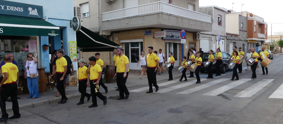 La banda de música ha recorrido las calles de Los Urrutias desde las ocho de la mañana para anunciar a vecinos y veraneantes que acababa de comenzar la jornada de la festividad de la patrona, la Virgen del Carmen.