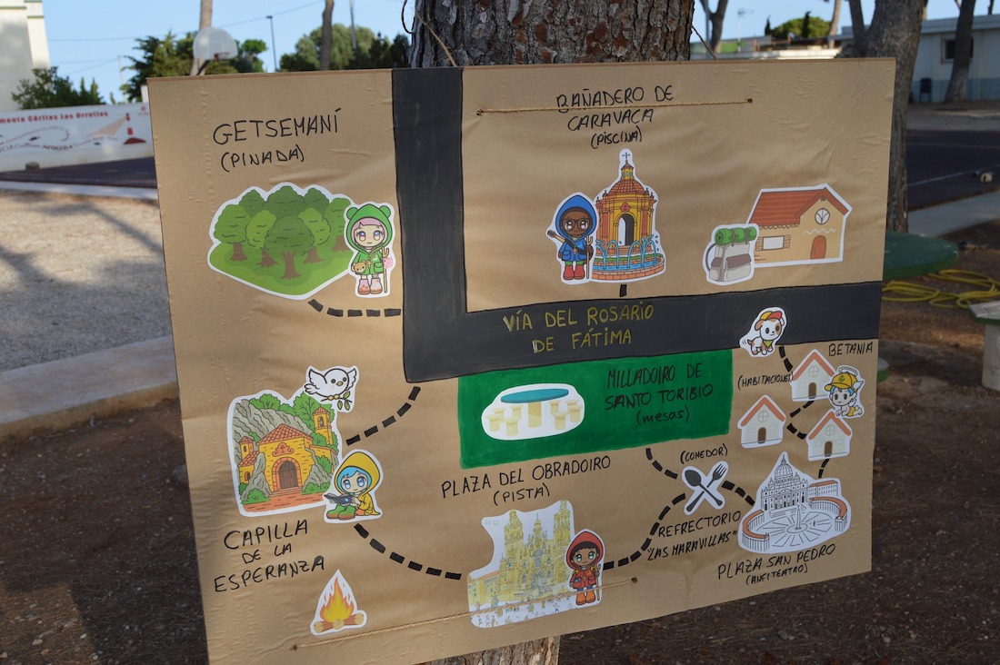 Jerusalén, Roma, Santiago de Compostela, Santo Toribio de Liébana y Caravaca de la Cruz, los cinco lugares de peregrinación permanente de la cristiandad, se recuerdan en diferentes lugares de las instalaciones para que los acampados disfruten estos días de una experiencia inolvidable. Todo relacionado con el Jubileo Ordinario de la Iglesia que celebramos en este 2025.