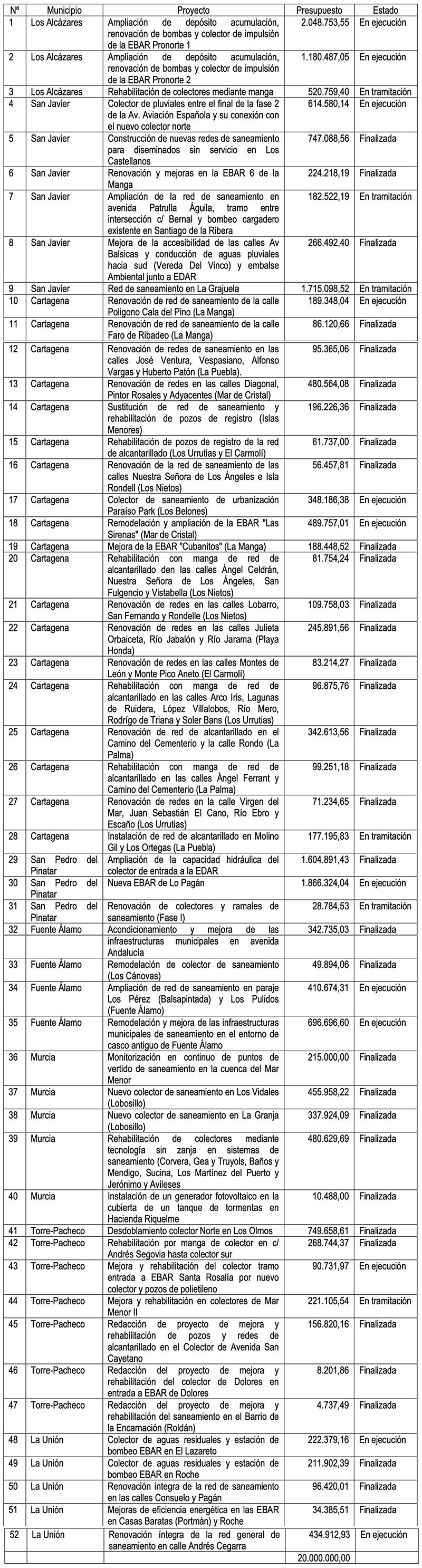 En conjunto, los ocho consistorios (Los Alcázares, San Javier, Cartagena, San Pedro del Pinatar, Fuente Álamo, Murcia, Torre-Pacheco y La Unión) han previsto realizar 52 actuaciones, que beneficiarán a casi 230.000 habitantes de la cuenca vertiente, consistentes en la reparación o construcción de más de 22.000 metros de alcantarillado; la construcción o remodelación de estaciones de bombeo de aguas residuales y la incorporación de sistemas de generación de energía fotovoltaica a estas instalaciones.