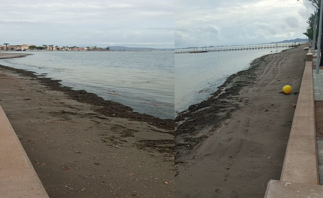 La situación con las lluvias ha sido más tranquila en Los Urrutias que en el interior de la diputación. La imagen de Juan Pagán muestra el aspecto que ofrece esta mañana el Mar Menor en el pueblo, con una tonalidad marrón que apenas se da en la orilla, a diferencia de las desembocaduras de ramblas en la laguna salada.