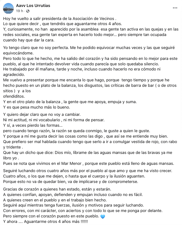 María del Rosell García Jiménez, quien es presidenta desde enero de 2022, ha escrito lo siguiente en el Facebook de la Asociación de Vecinos de Los Urrutias tras ser reelegida: