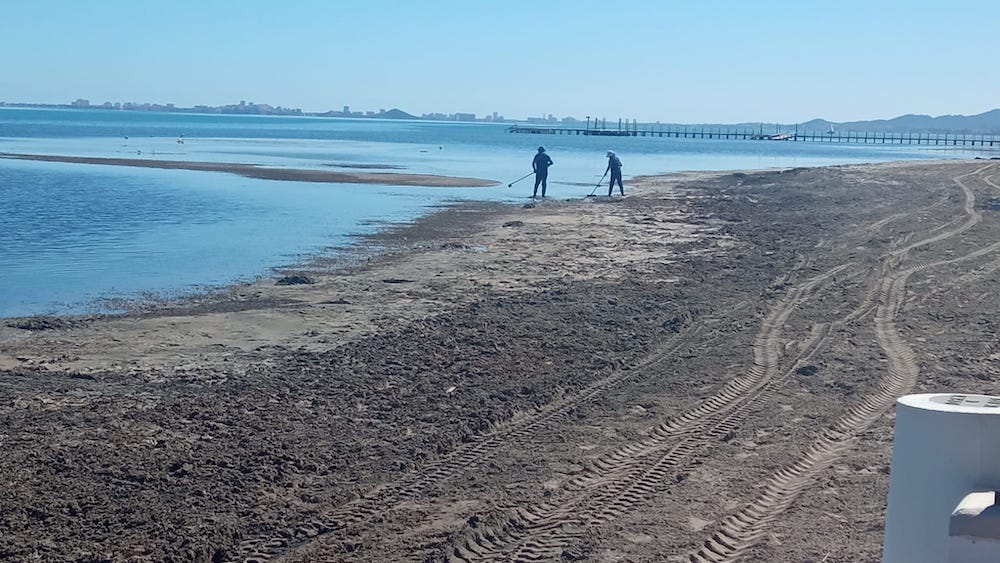 La manual (e insuficiente) labor de limpieza de la playa de Los Urrutias continúa, ahora también acompañada por el trabajo en la arena para un mejor aspecto de cara a la Semana Santa, cuando volverá a aumentar la cifra de residentes y visitantes.